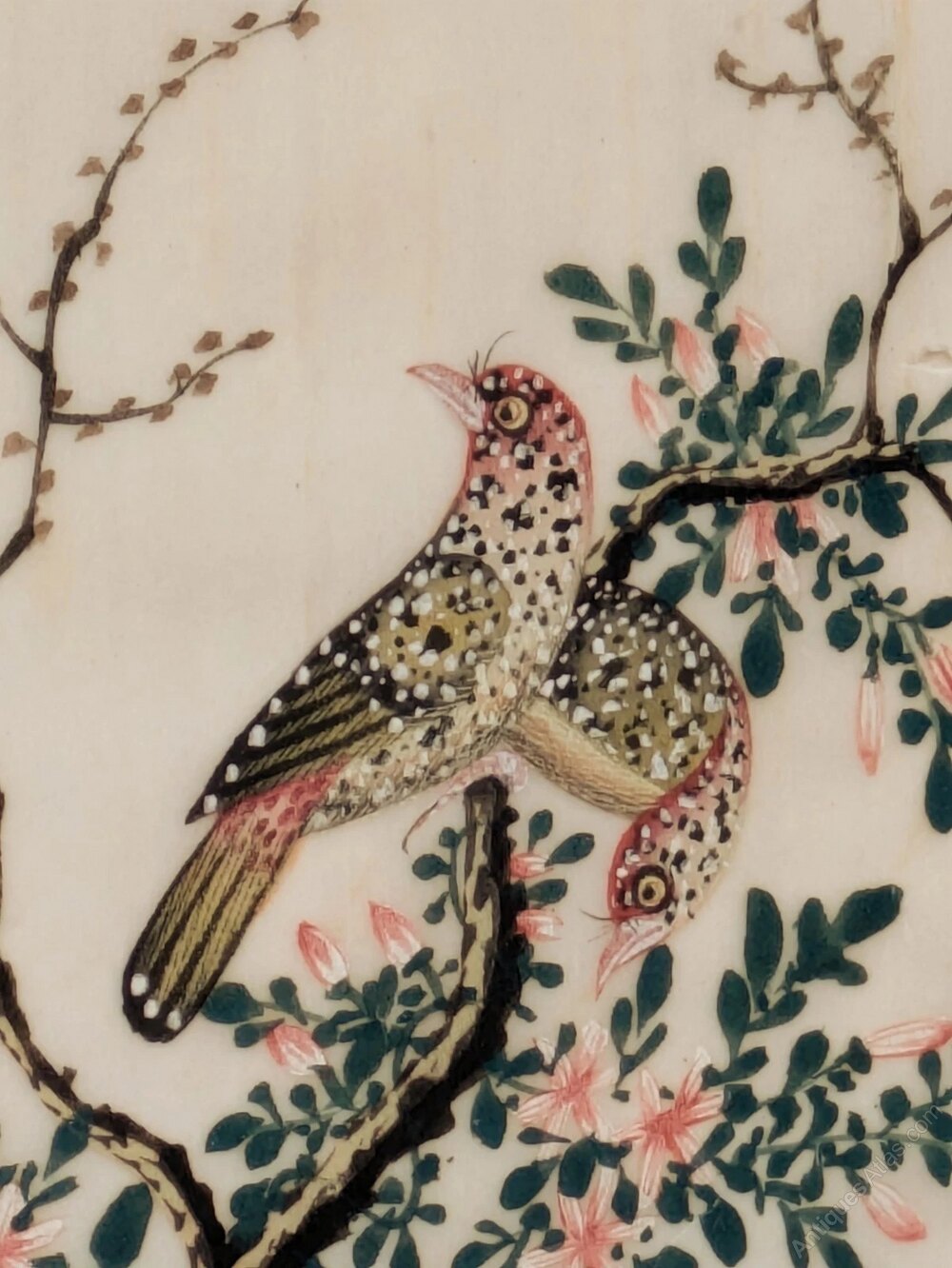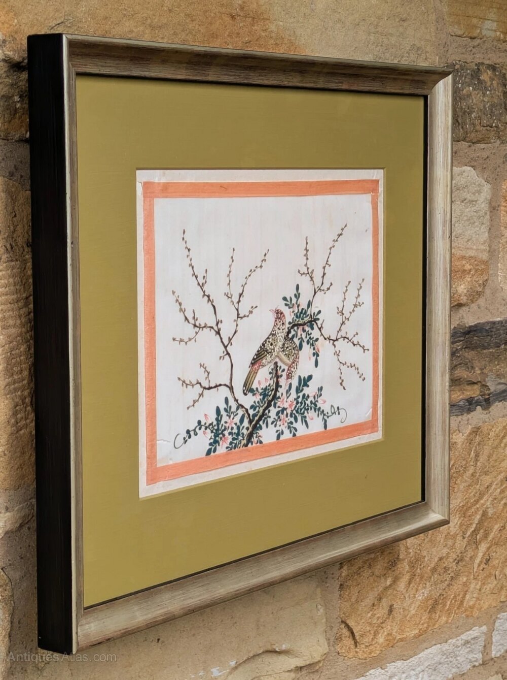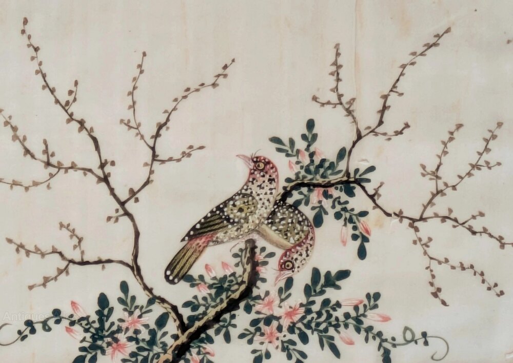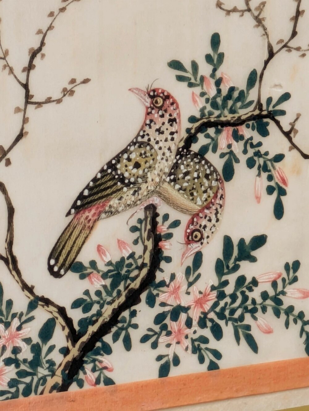 This is a beautiful Chinese gouache watercolour study of birds dating from the mid 19th Century. The painting depicts the birds in a naturalistic setting and is extremely well executed. Painted on pith in strong gouache colours, this in really good condition for its age. The watercolour is framed by a single narrow peach ribbon as was typical of the time and has recently been mounted and displayed in a good quality Italian silver gilt frame which suit the work beautifully.