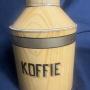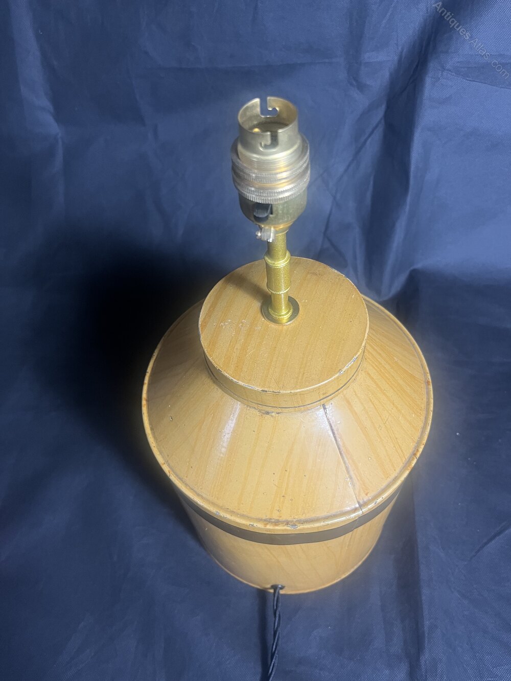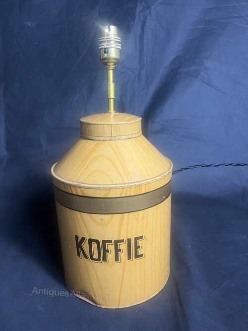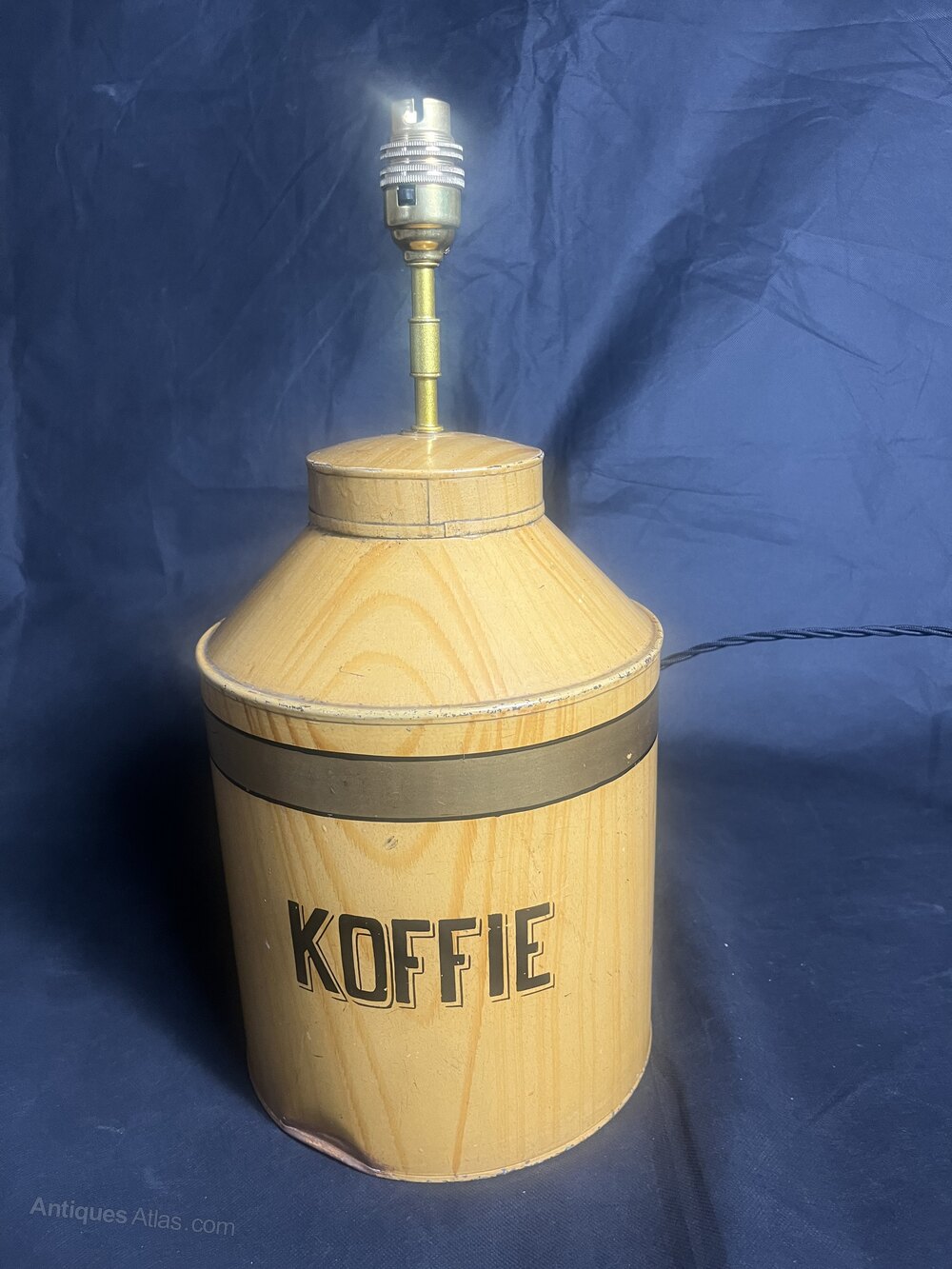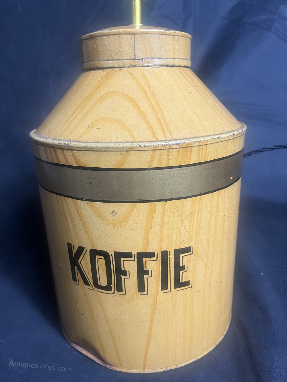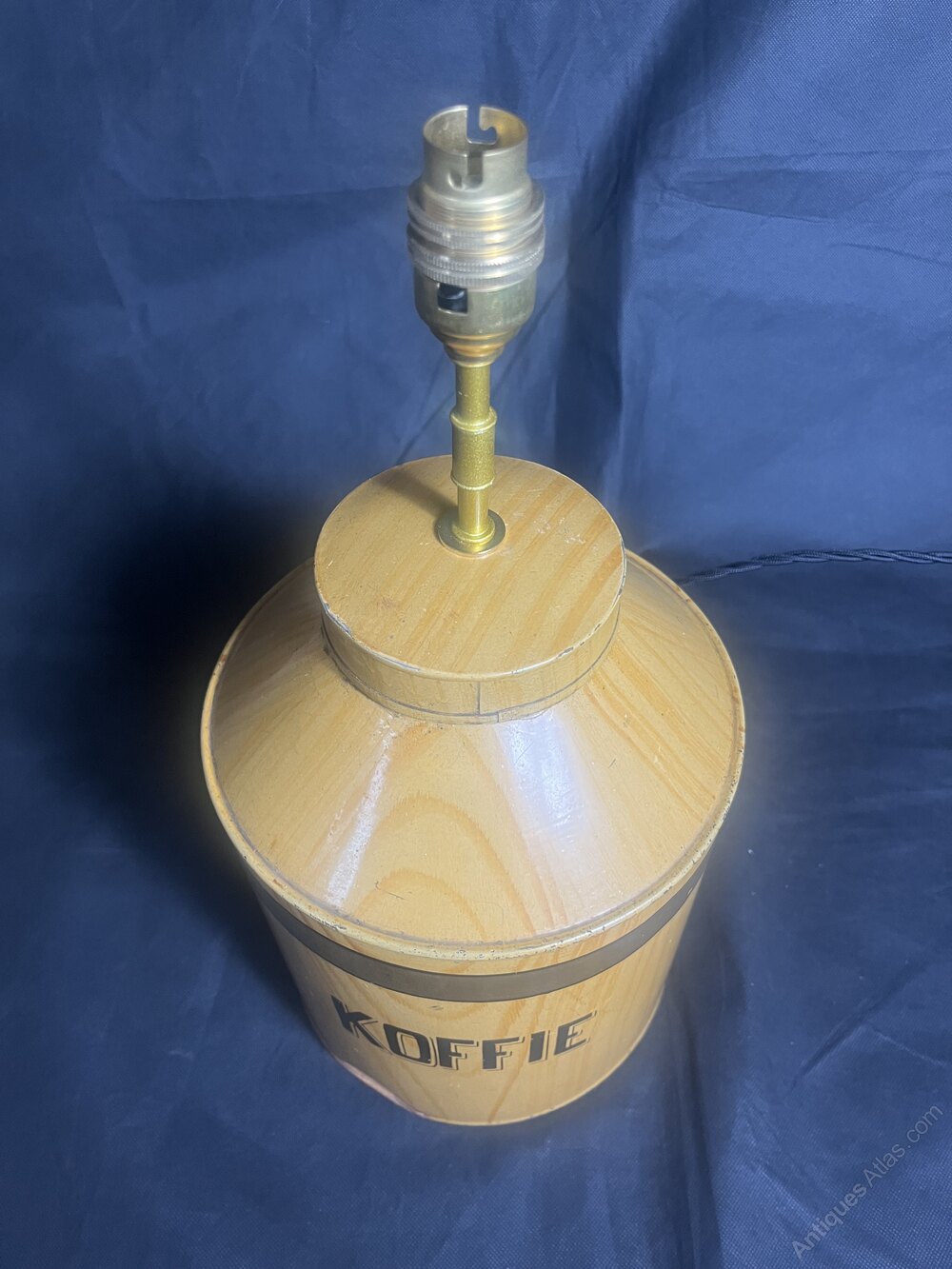 Antique tin toleware coffee cannister turned into a table lamp. Rewired in black flex with PAT testing, brass fittings. Cannister 29 cms tall.