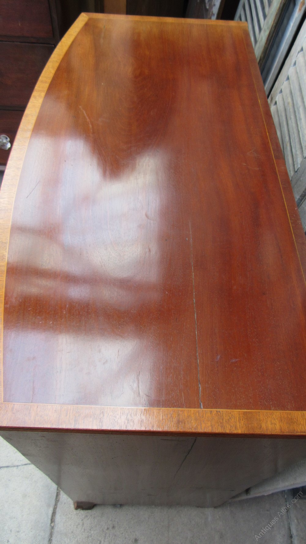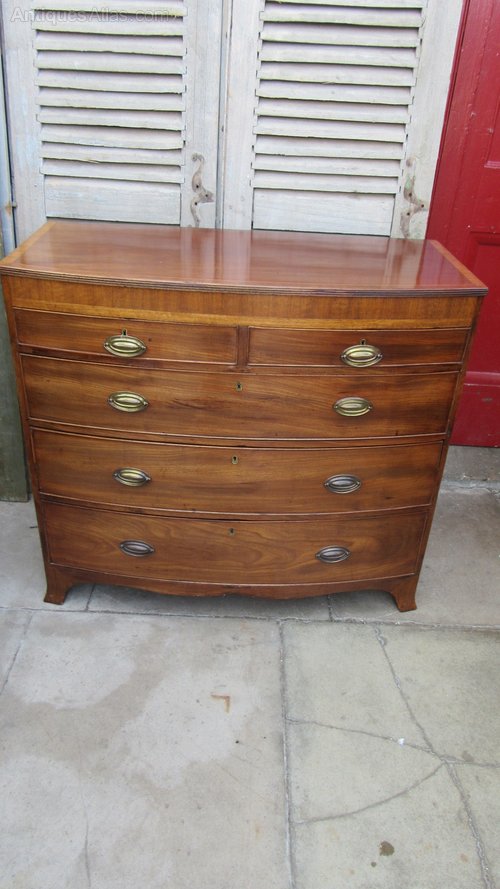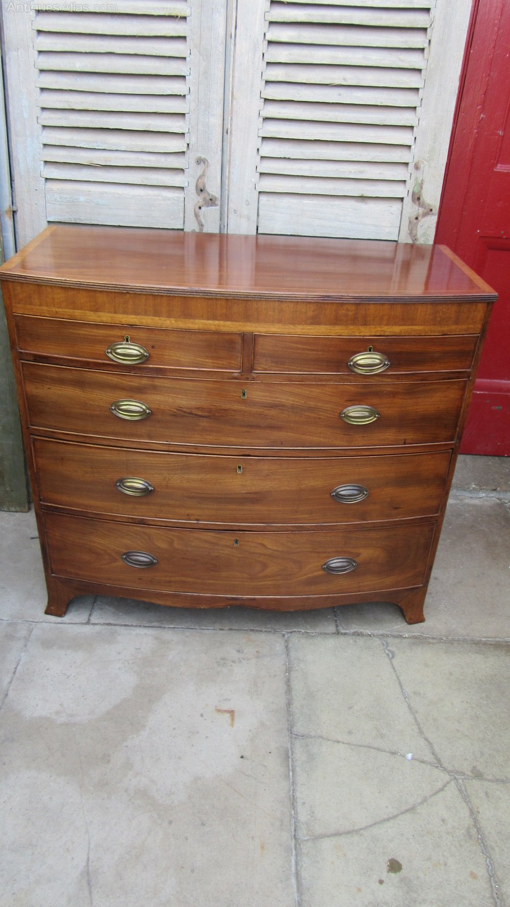 Antique Crossbound Mahogany Bowfront Chest of Drawers with Oak Lining ,Bit of Cock beading missing and a couple of splits in the drawers see pictures ,96 cm high ,107 cm wide,51 cm deep