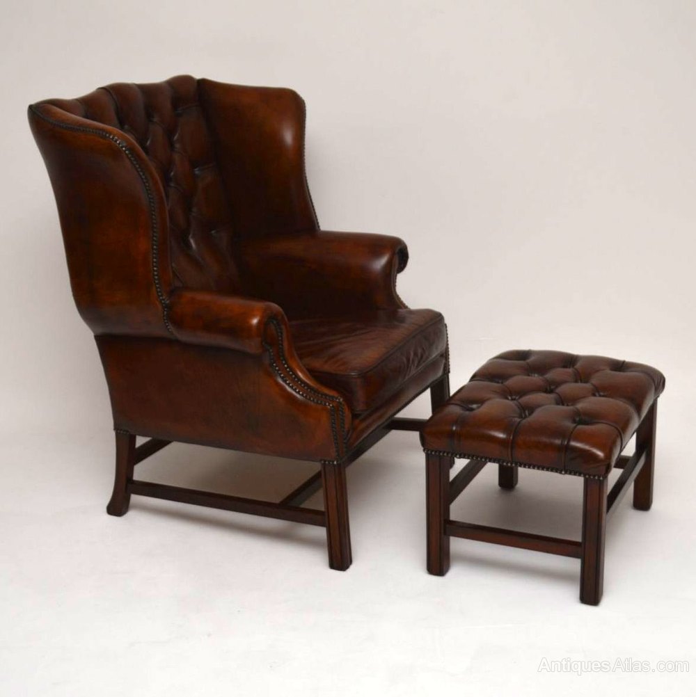 Antique Chippendale leather wing armchair in great condition & with a lovely original colour. This chair is very comfortable with good back & head support. It has a deep buttoned back, a loose cushion & is hand studded all around. The legs are mahogany with cross stretchers that help give it more stability. I would date this chair to around the 1950's period. There is also a matching footstool which is showing on the website & there is also one image showing here. The stool is priced up at £250, but if someone wants the two items together, then they can be bought for £1000 together.