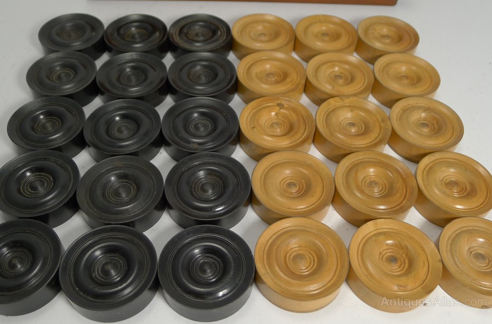 The set is complete and undamaged, with 15 each of turned Ebony and Boxwood counters all contained in a polished wooden storage box, with a sliding lid.
