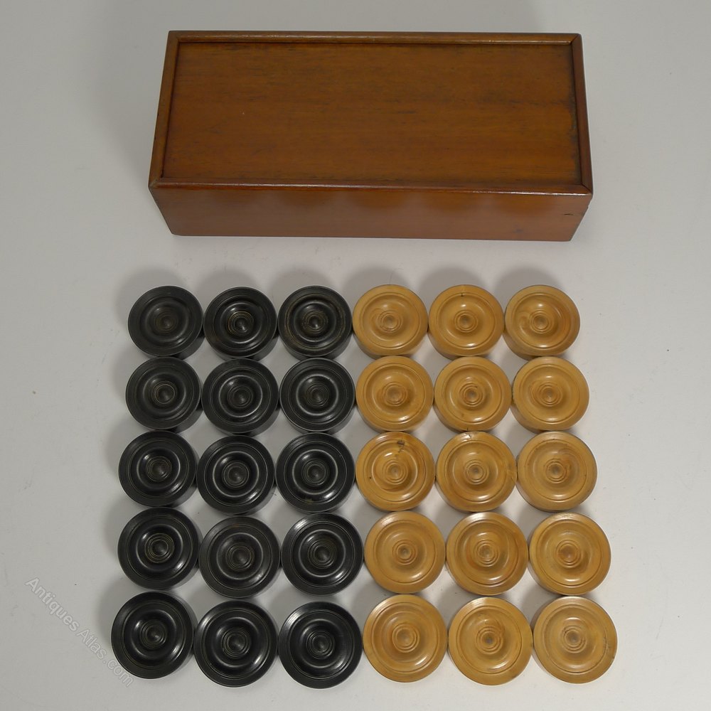 A fabulous boxed set of late Victorian or early Edwardian games counters, perfect for Draughts or Backgammon.