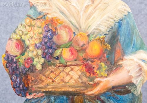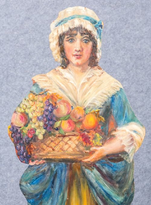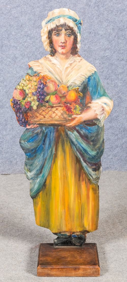 A very decorative 19th.Century pine dummy board figure of a young woman dressed in a blue and yellow dress with lace ruffs, a bonnet and carrying a basket of flowers all in vibrant colours and very good condition.