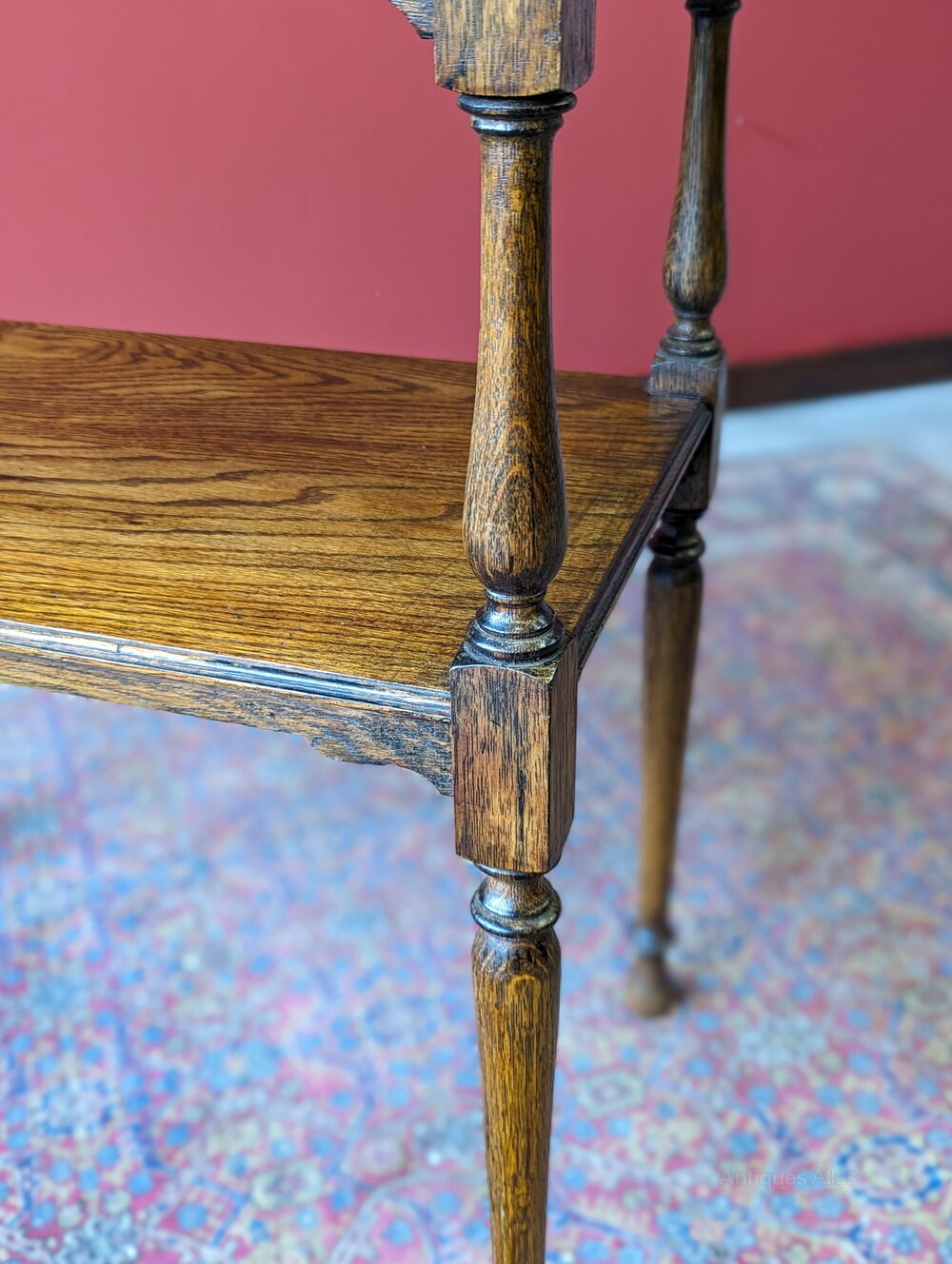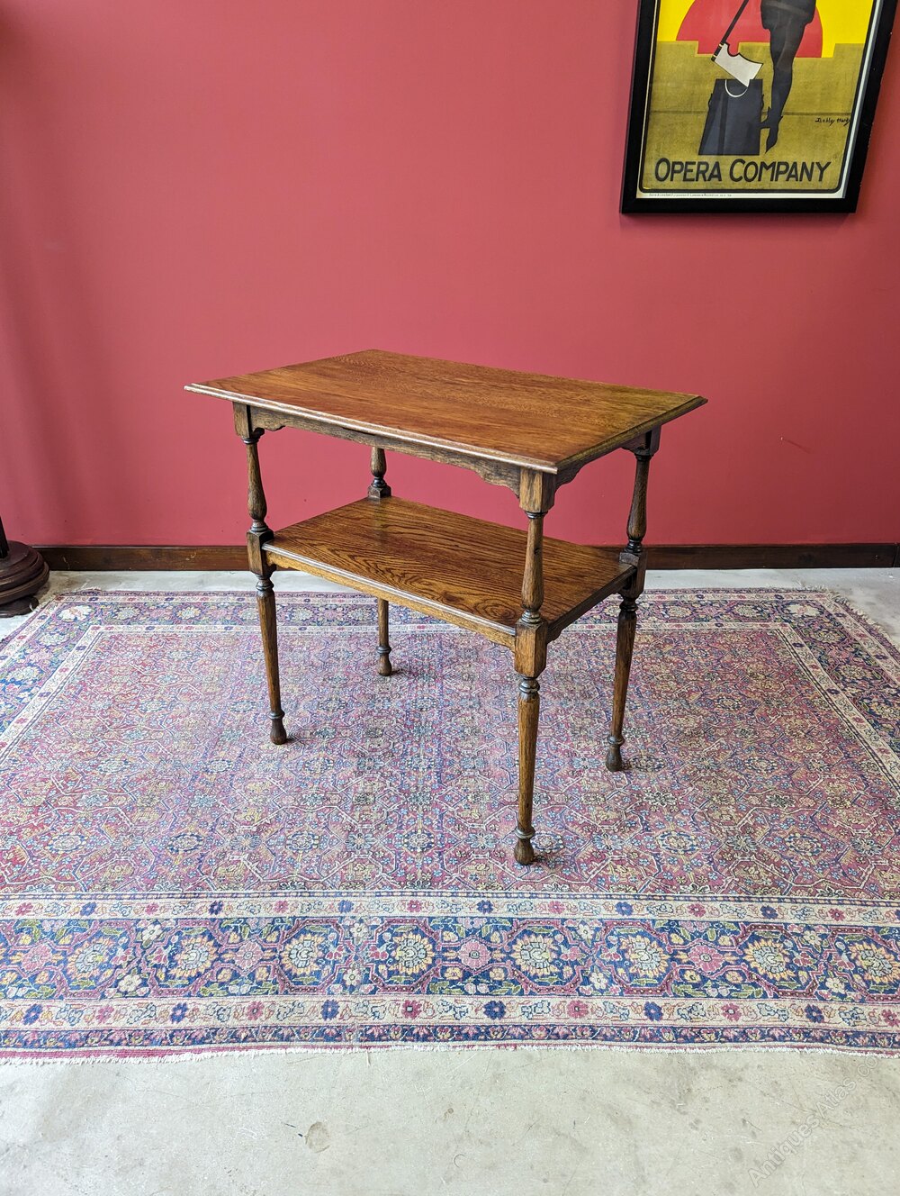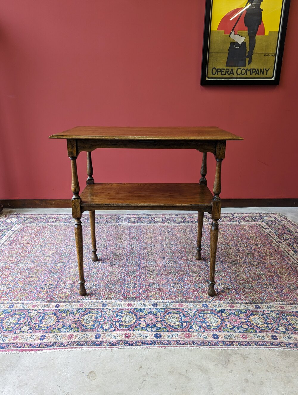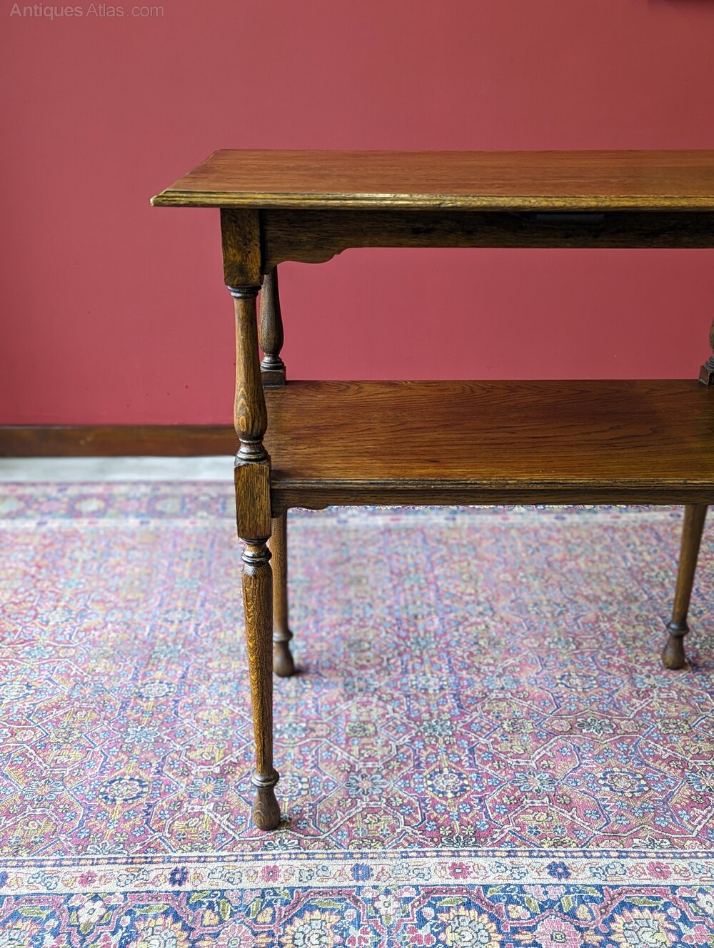 An attractive early 20th century oak table raised on tall turned legs united by a lower tier.