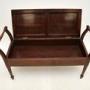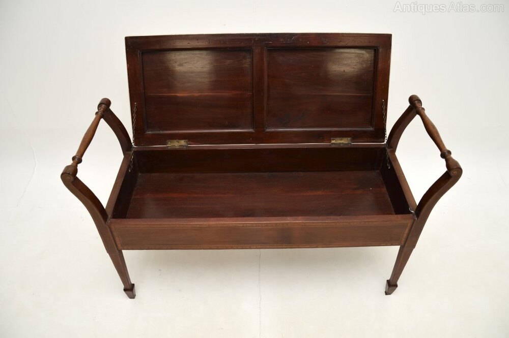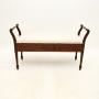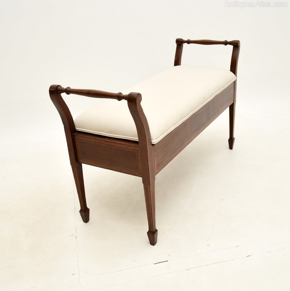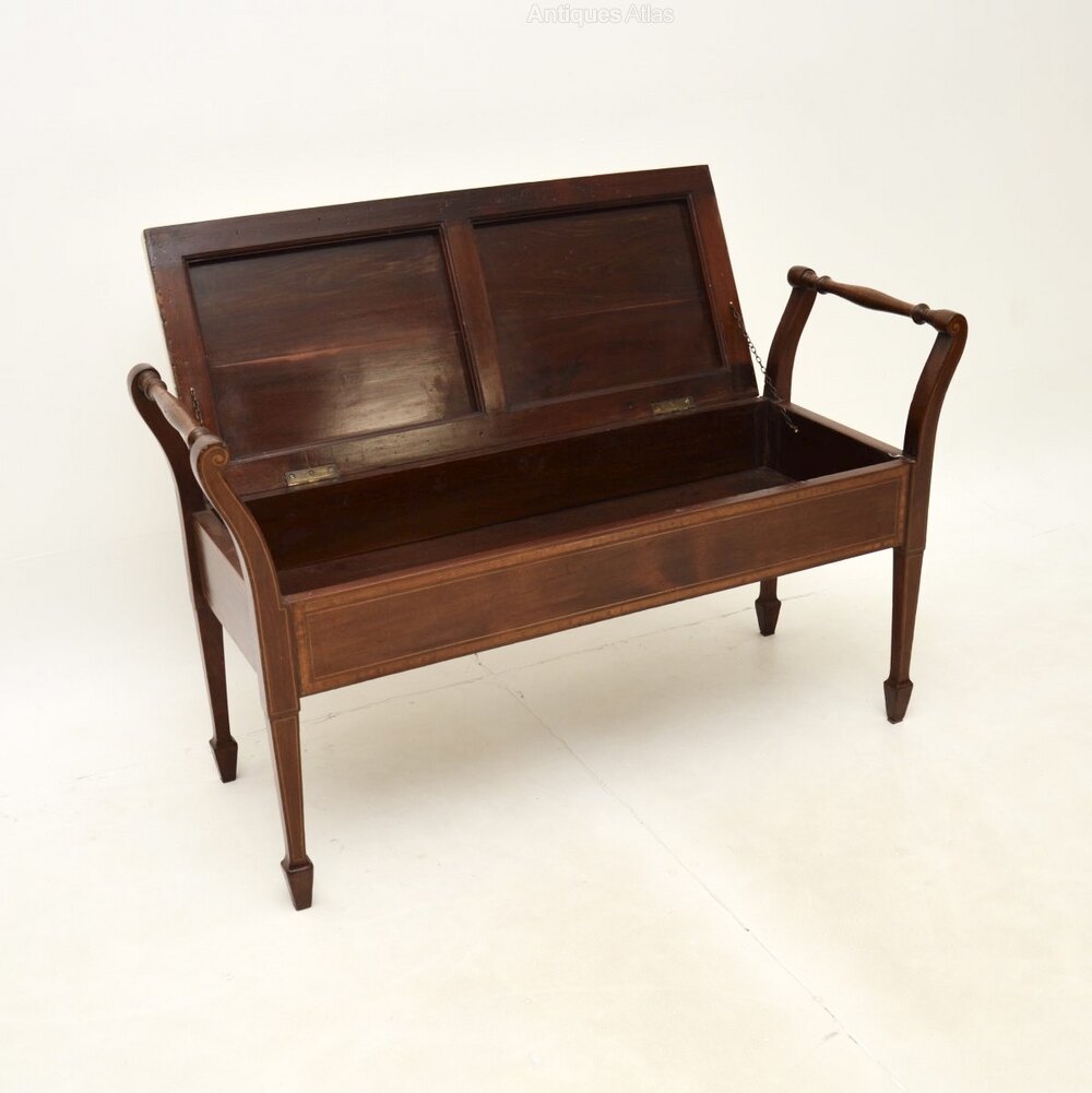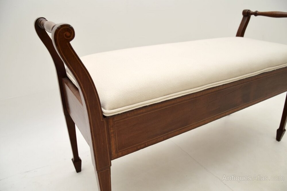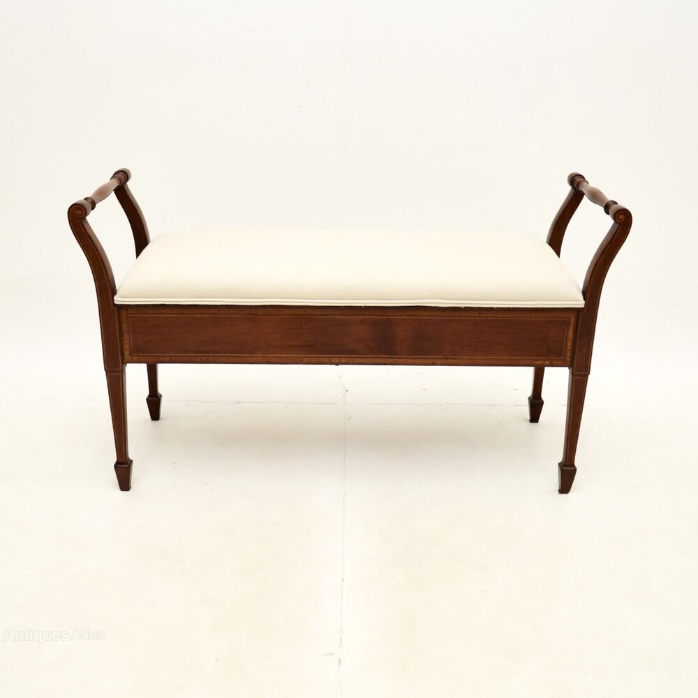 The quality is excellent this has a gorgeous and very useful design. Designed for duets at a piano, this is very useful as a storage bench for an entry way, window seat or even at the foot of a bed. There are beautiful satin wood inlaid banded edges on all sides, the front and back are finished identically, so it can be used as a free standing item. The upholstered seat lifts up to reveal a useful storage compartment, this has nicely tapered legs terminating in spade feet.