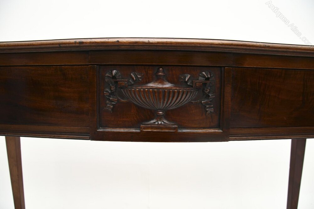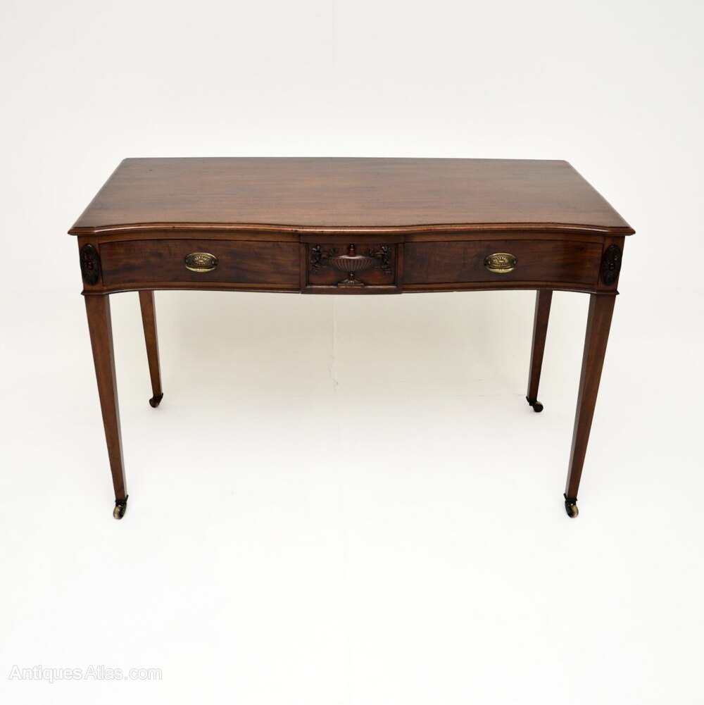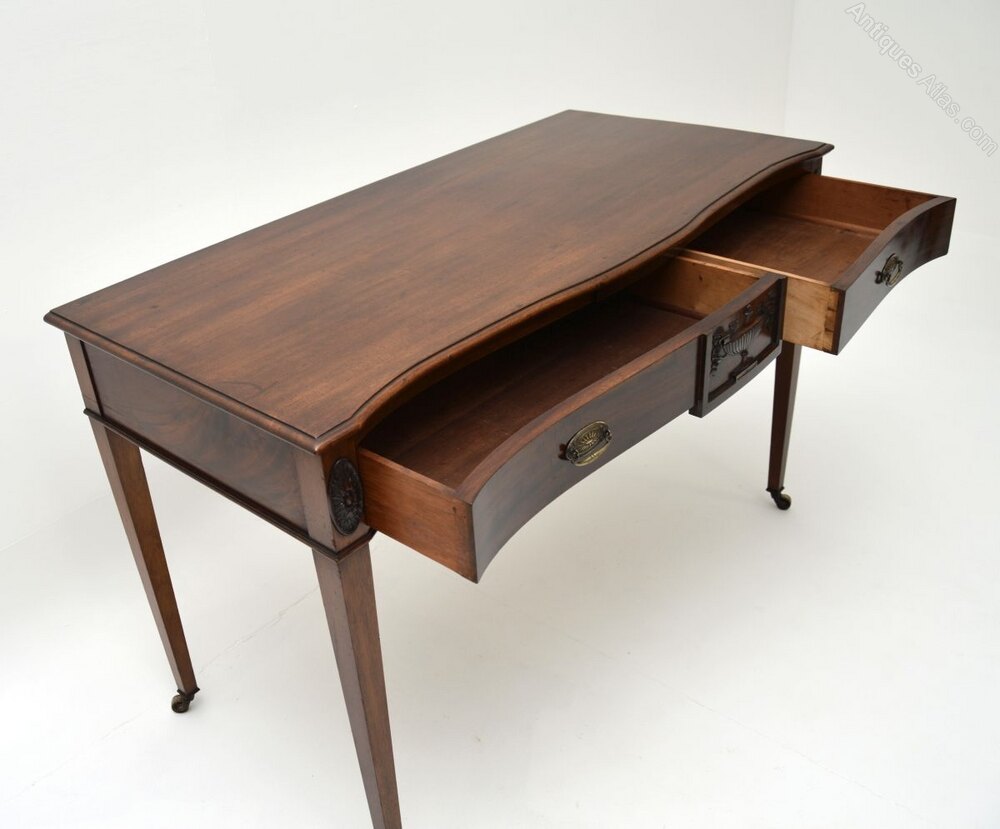 It is of wonderful quality, it is a great size and it is nicely designed with a serpentine shaped front. The mahogany displays a wonderful patina and gorgeous colour tones. There are two drawers with brass ring pull handles, this stands on tapered legs terminating in original brass casters. There are beautifully carved rosettes on the corners, and a carved urn on the centre panel.