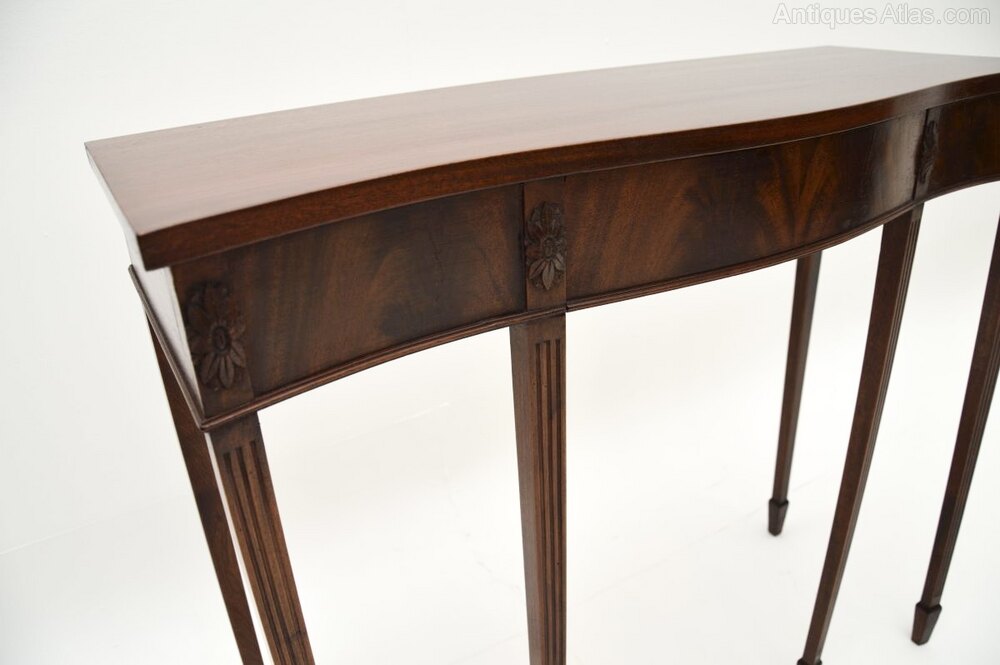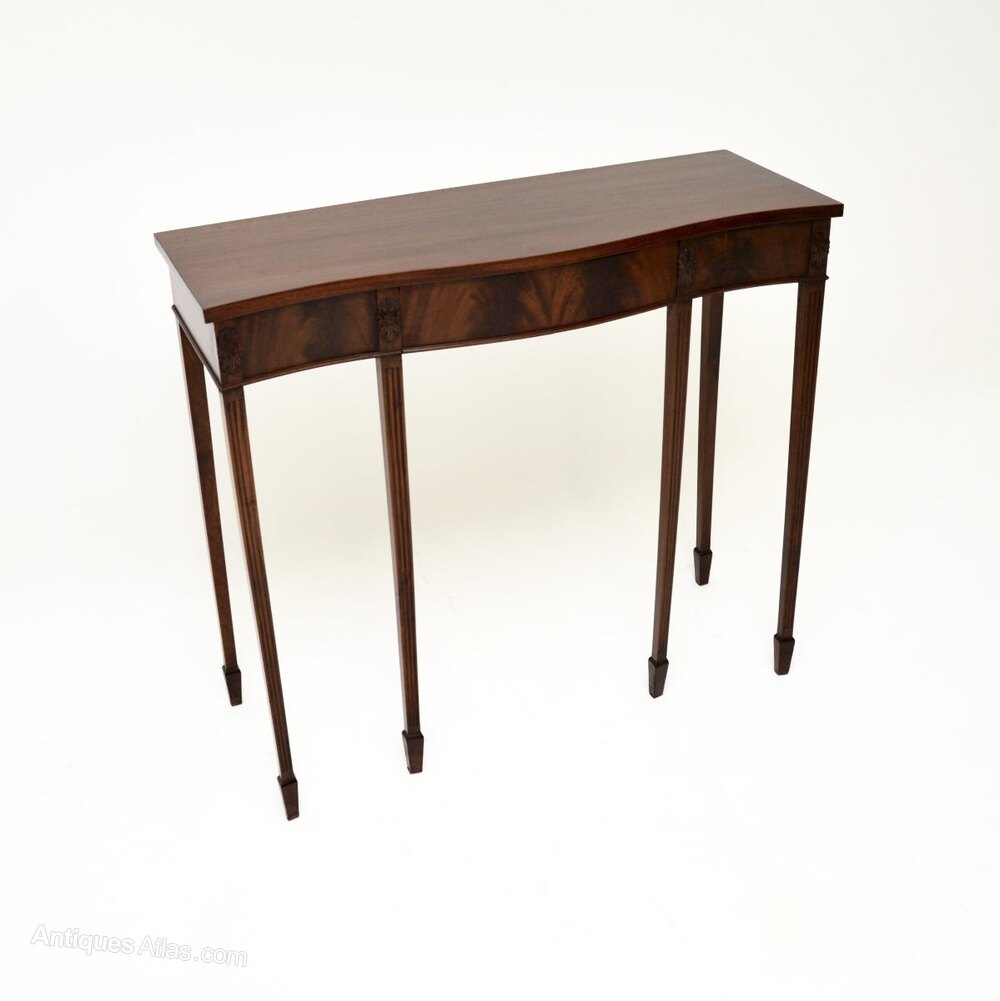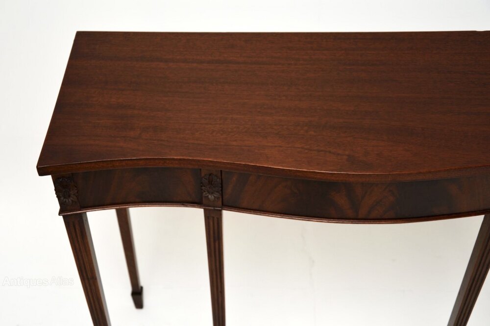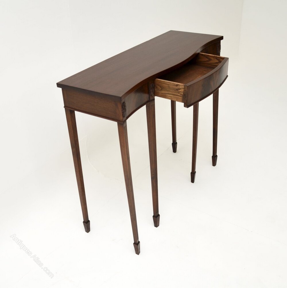 It is of very fine quality and has a beautiful, elegant design. It is a very useful size, perfect for use as a narrow hall table. The top has a serpentine shaped front with a single drawer which has hidden recessed handles. It stands on very elegant yet sturdy tapered legs.