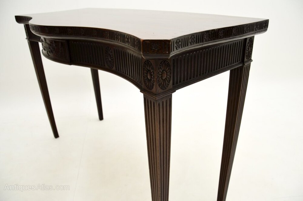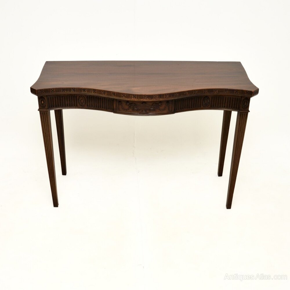 The quality is superb and this has very useful proportions, the mahogany has a gorgeous colour tone and patina. It has a serpentine shaped top with lovely carving around the edges, it stands on tapered grooved legs.