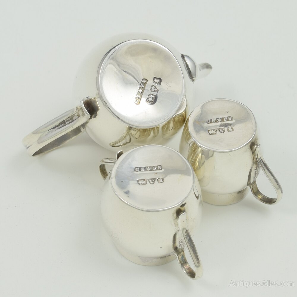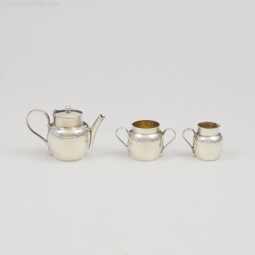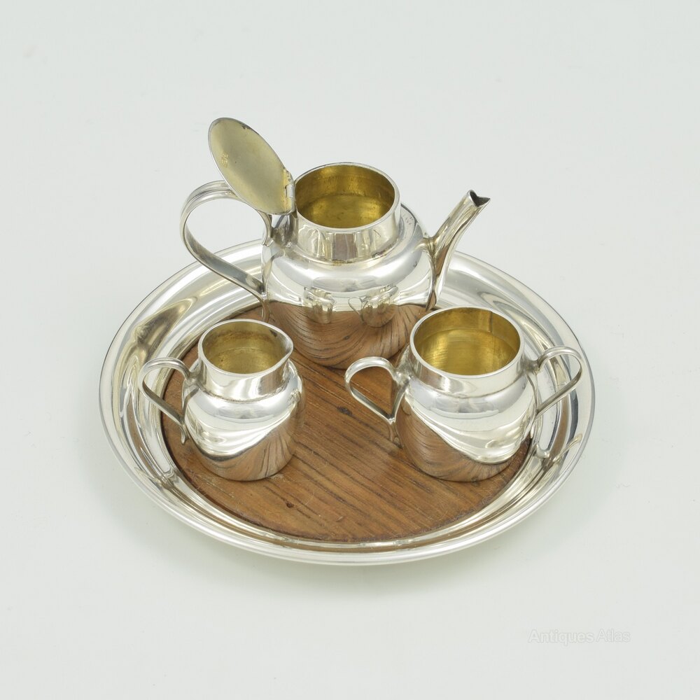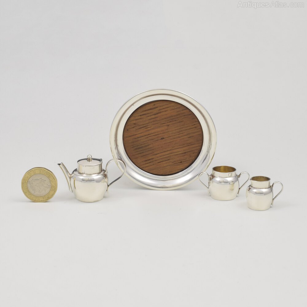A fine quality miniature English silver four piece tea set comprising teapot, sugar bowl, milk jug and tray. Possibly made for a very high end doll's house or as a novelty amusement to entertain friends on social evenings. Superb quality, the teapot cover is hinged and all three vessels are gilded inside. The tray is silver framed with a small disc of oak that clicks into place. All pieces fully hallmarked for 1905, makers Cornelius Desormeaux Saunders & James Francis Hollings (Frank) Shepherd, the tray assayed in Birmingham and the others in Chester.