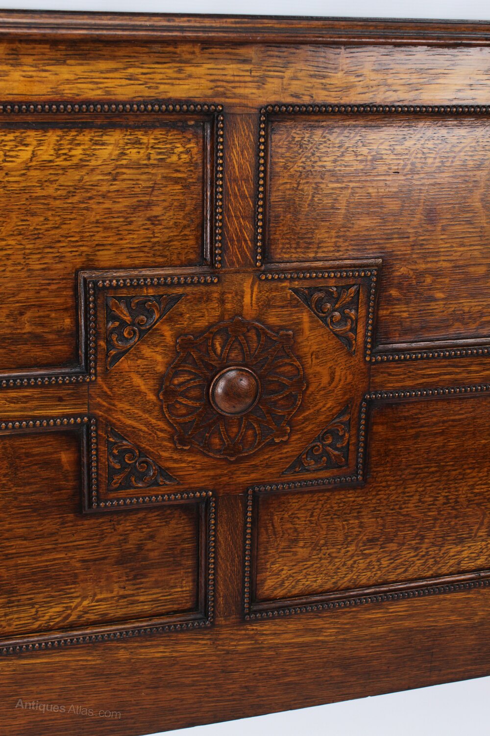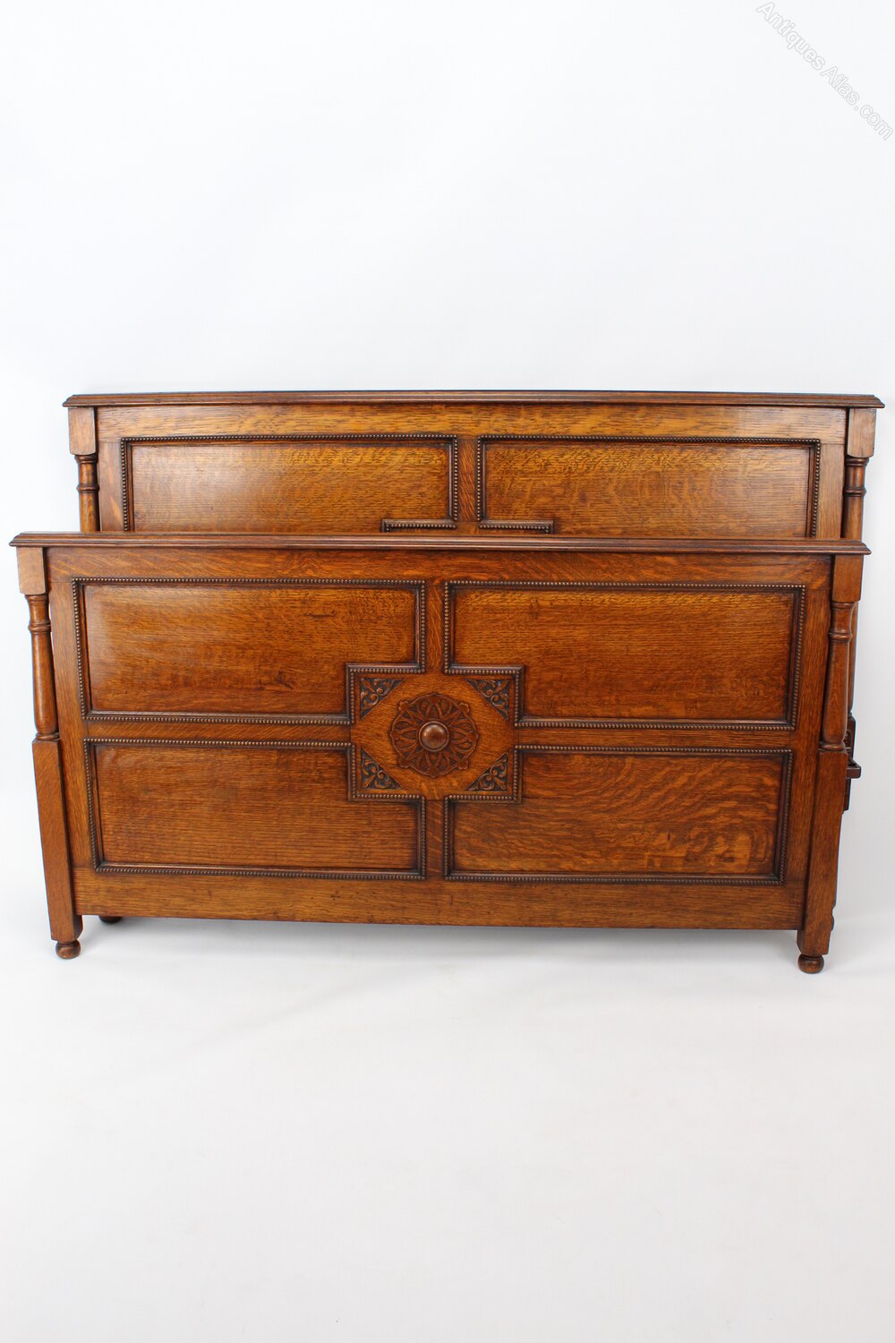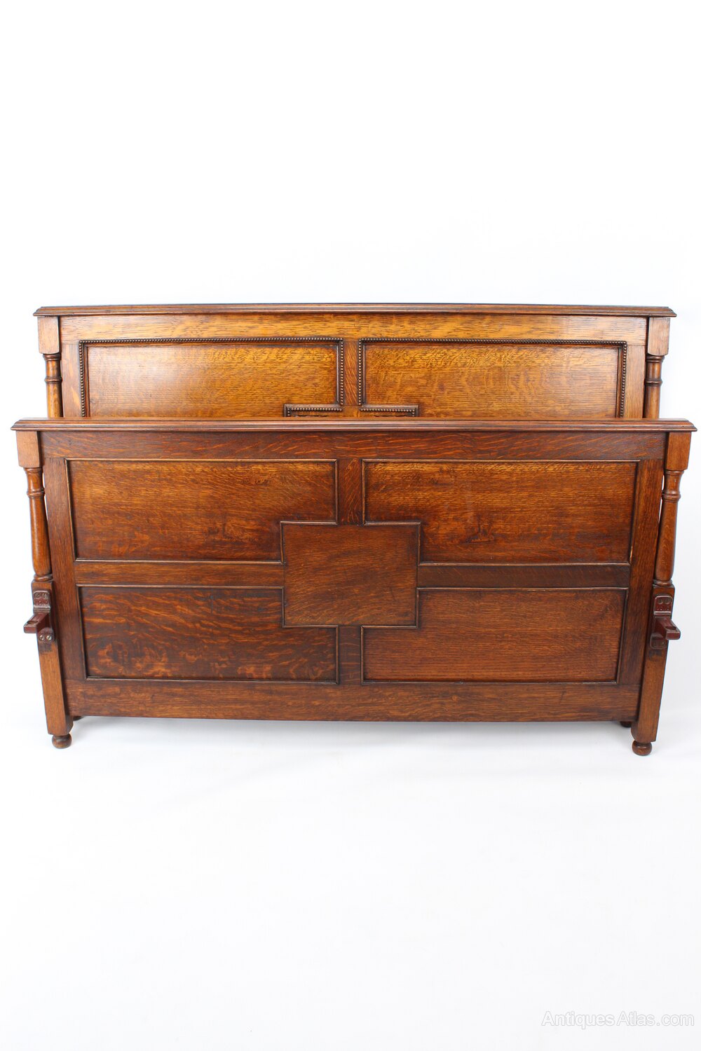 A handsome antique Edwardian oak double bed dating from circa 1910. In a richly figured quarter sawn oak, the headboard and footboard are of a panelled construction with attractive beading decoration and a central Jacobean revival motif. It stands on tapered legs with bun feet. The headboard and footboard are joined together with screw in side rails and is easily assembled or dis-assembled with a Vono spanner (provided). Good warm patina and colour. Comprising of a headboard, footboard and iron rails. (no base included).