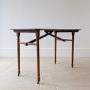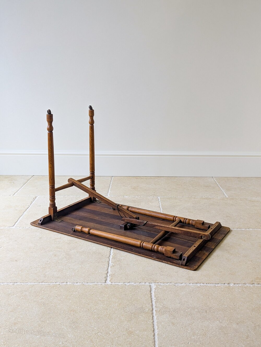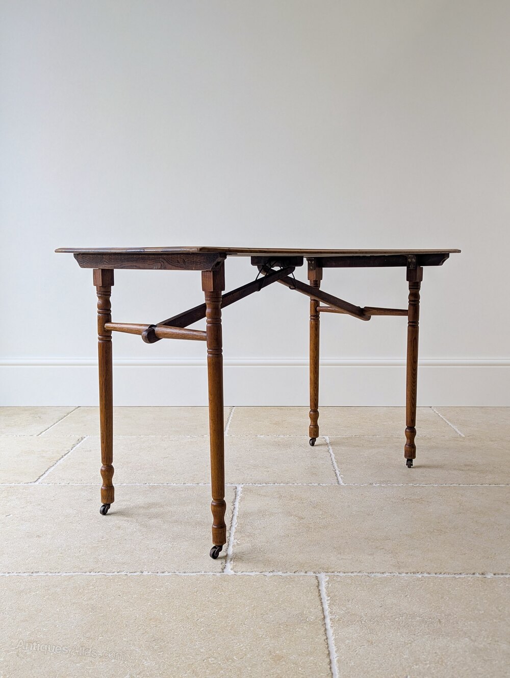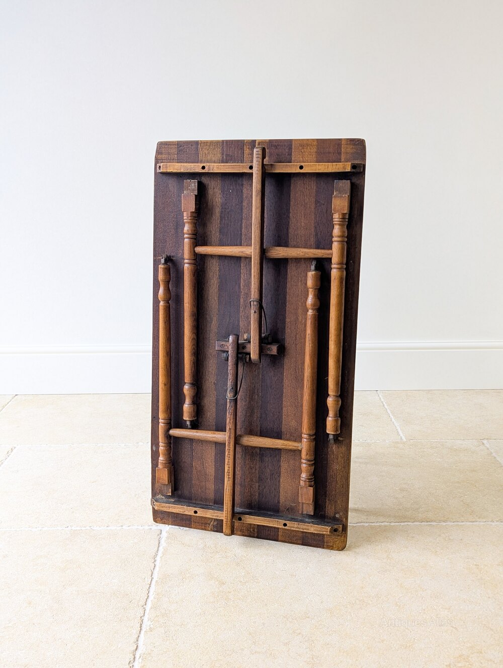An Edwardian folding table constructed in oak, with a rectangular top of alternating light and dark planks within a moulded edge, set over a well-designed folding underframe with sprung stays and a central pivoting brace supporting two hinged turned leg frames terminating in original castors.