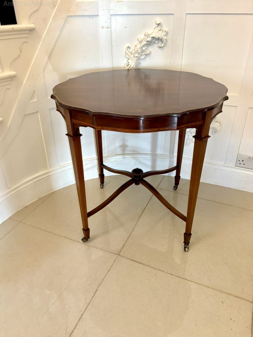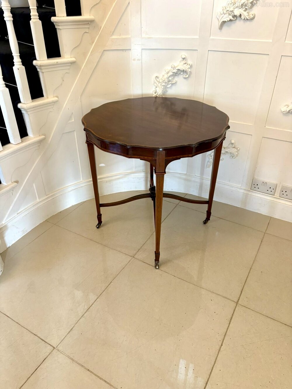 A refined Edwardian lamp or centre table of elegant form. The shaped top is beautifully figured and outlined with fine satinwood stringing, giving the table a sophisticated and decorative appearance characteristic of the late Victorian–Edwardian transitional style.