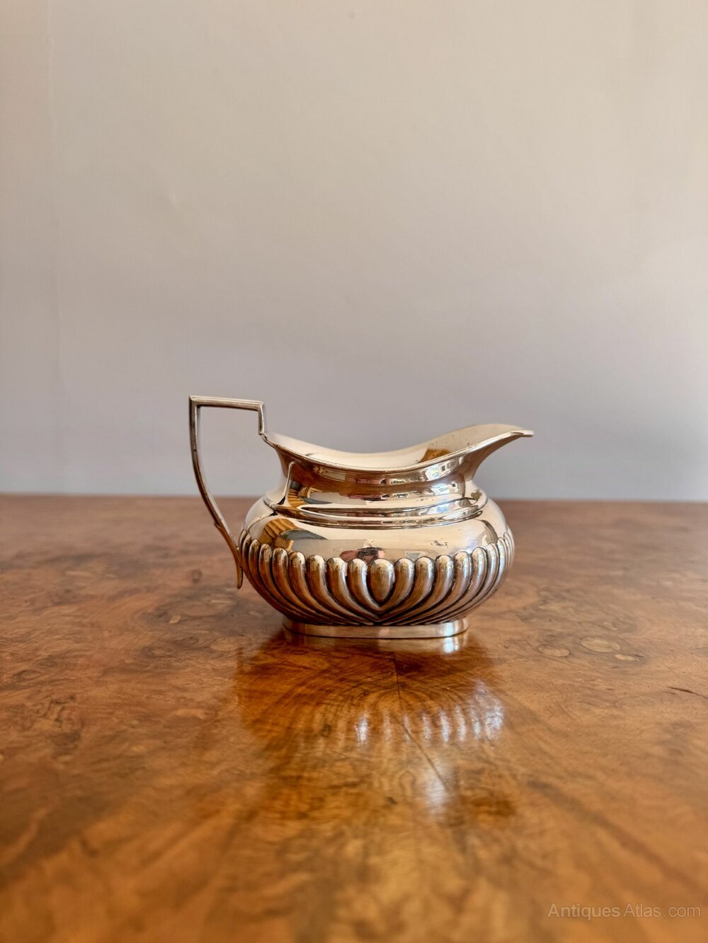 Antique Edwardian silver plate three piece tea set, having a quality antique Edwardian three piece tea set comprising of a teapot, milk jug and sugar bowl, all with matching embossed decoration.