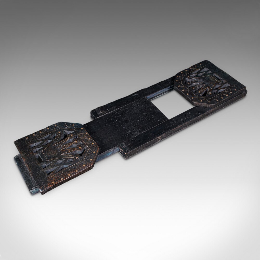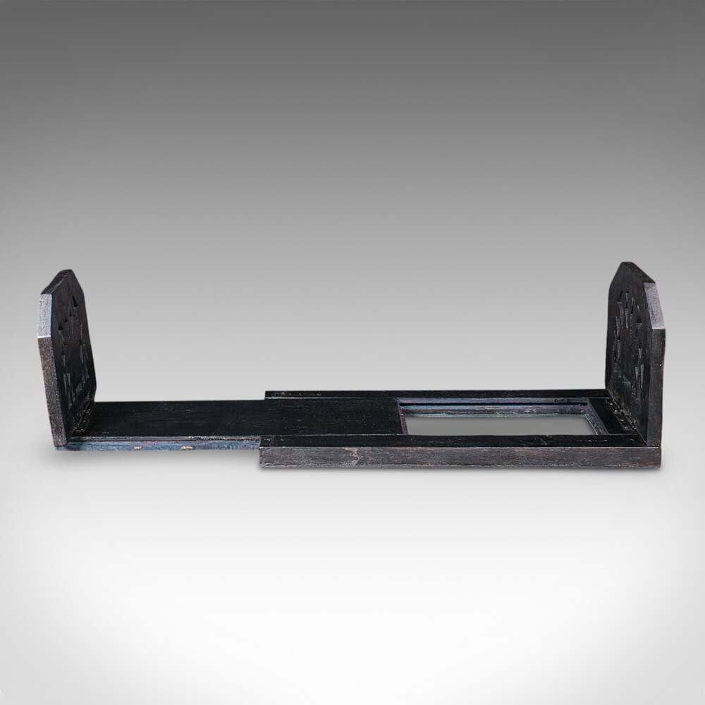 This is an antique extending book slide. An English, ebonised mahogany novel rest, dating to the Victorian period, circa 1870. A striking and practical desk accessory, with a dark aesthetic and refined decorative detail.