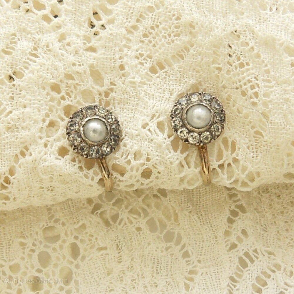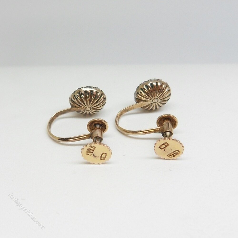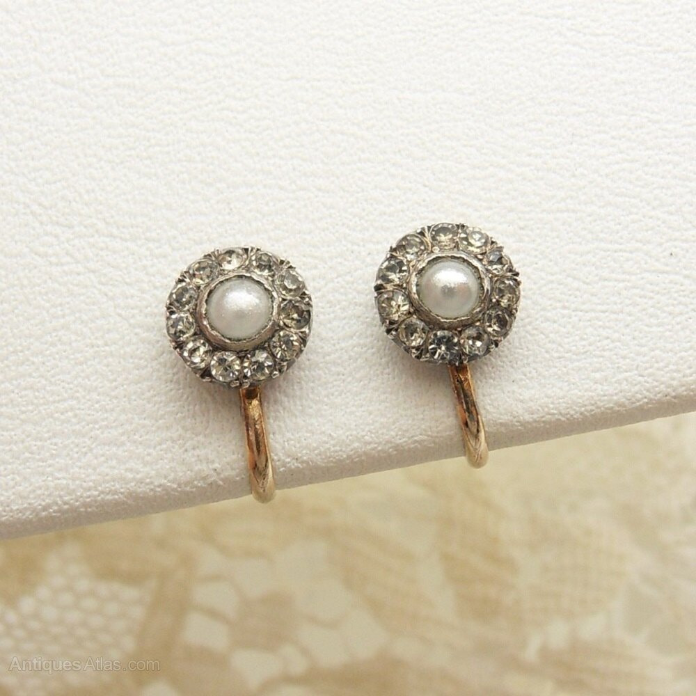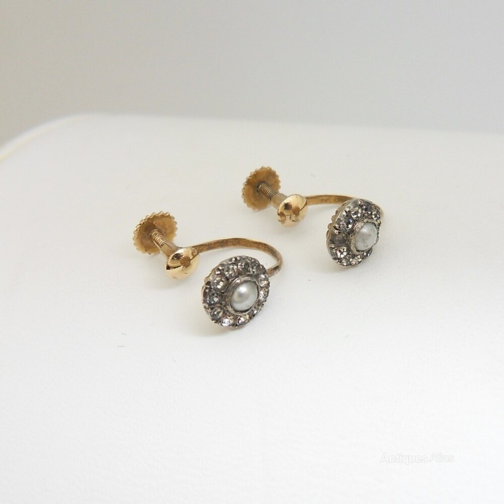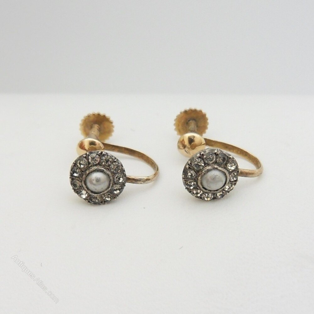 A very pretty pair of antique 9ct gold earrings with screw fitting fastenings. These dainty earrings feature a faux pearl to the centre surrounded by a circle of sparkly paste & are marked 9ct to the back of the screw.