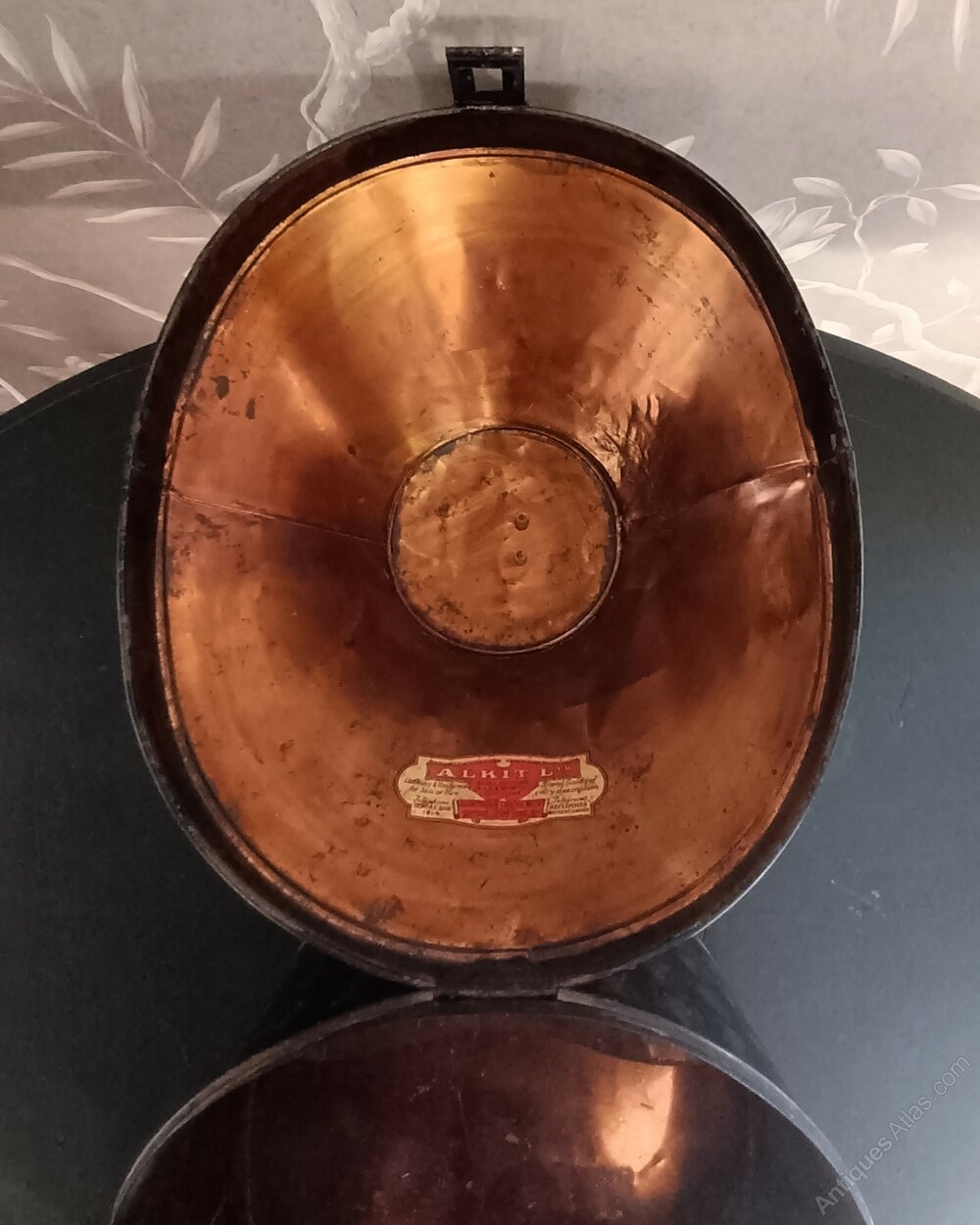 Antique faux tortoiseshell military tin hat box by ALKIT Naval Military R.A.F. & Sporting Outfitters Cambridge Circus London W.C.2., showing the original train label and C.J.F. initials.