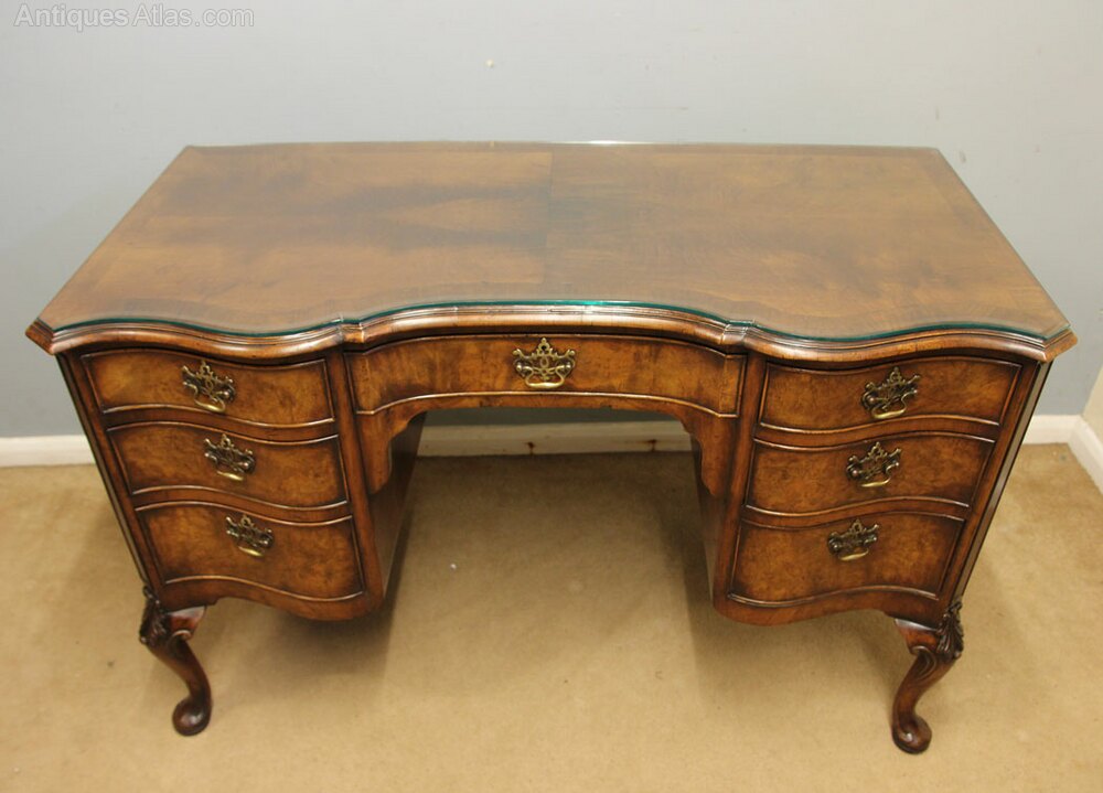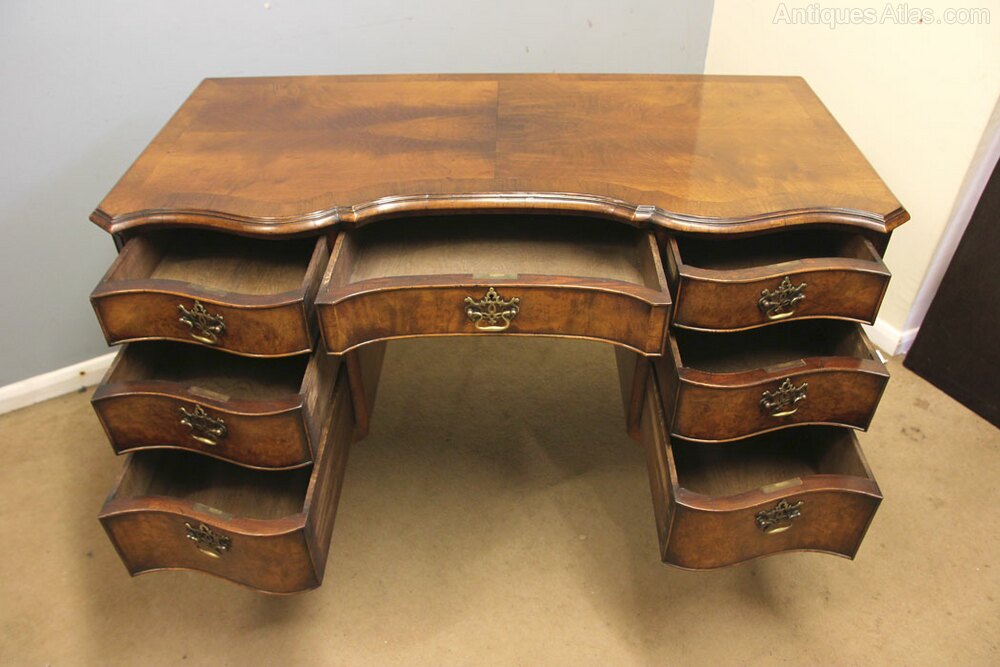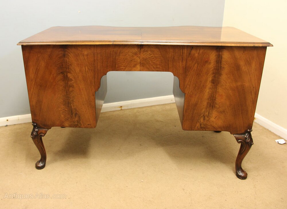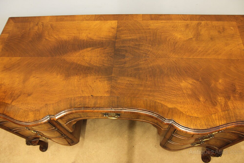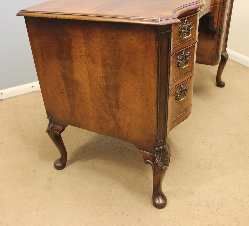 Antique Figured Walnut Kneehole Writing Desk, This antique figured walnut serpentine shaped writing desk has a walnut quarter veneer top with a crossbanded edge under having seven shaped drawers all with oak linings and fitted with brass handles, The knee hole desk is supported by lovely cabriole legs with carving to the knee, The writing desk is polished all round allowing the desk to stand in the centre of a room.
