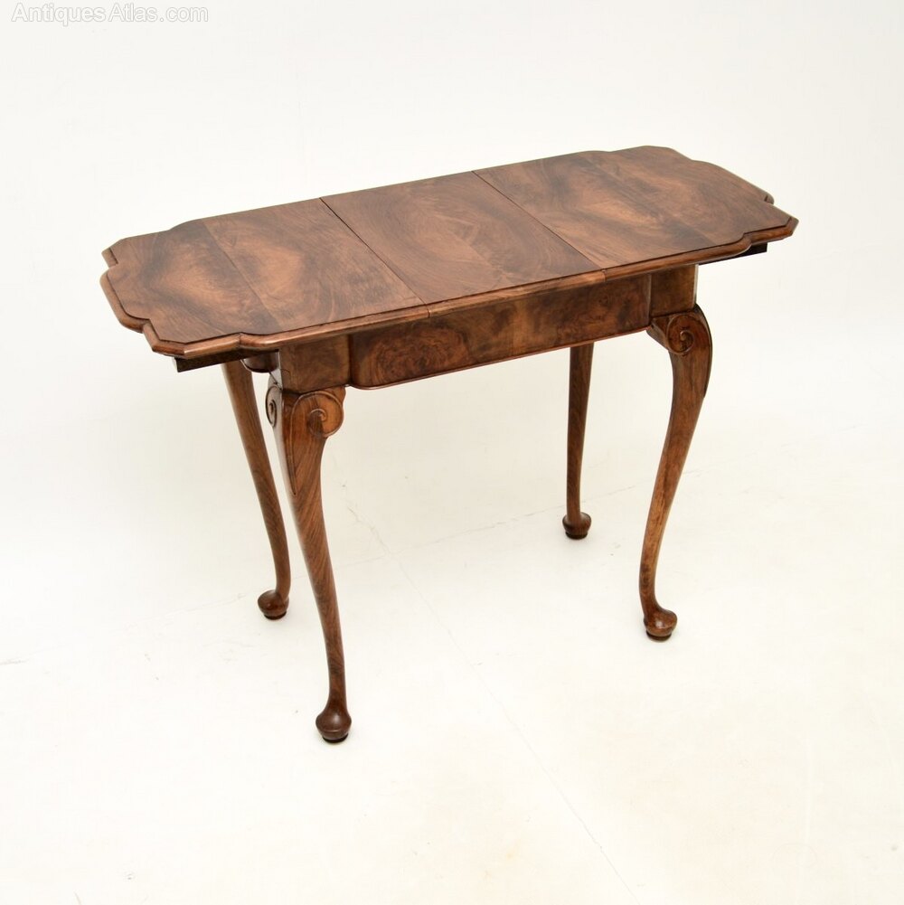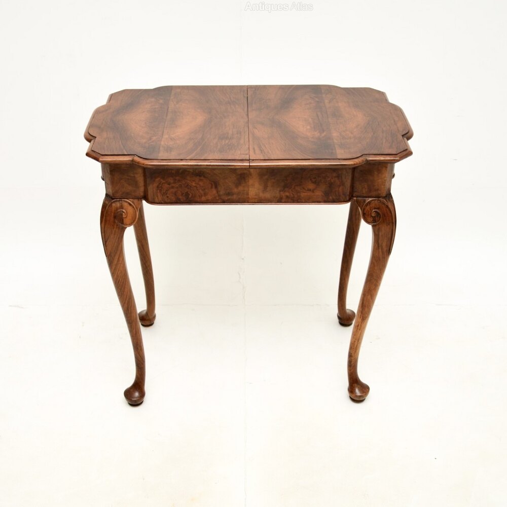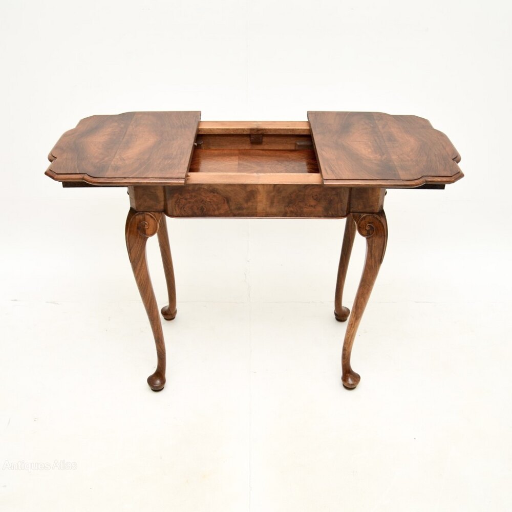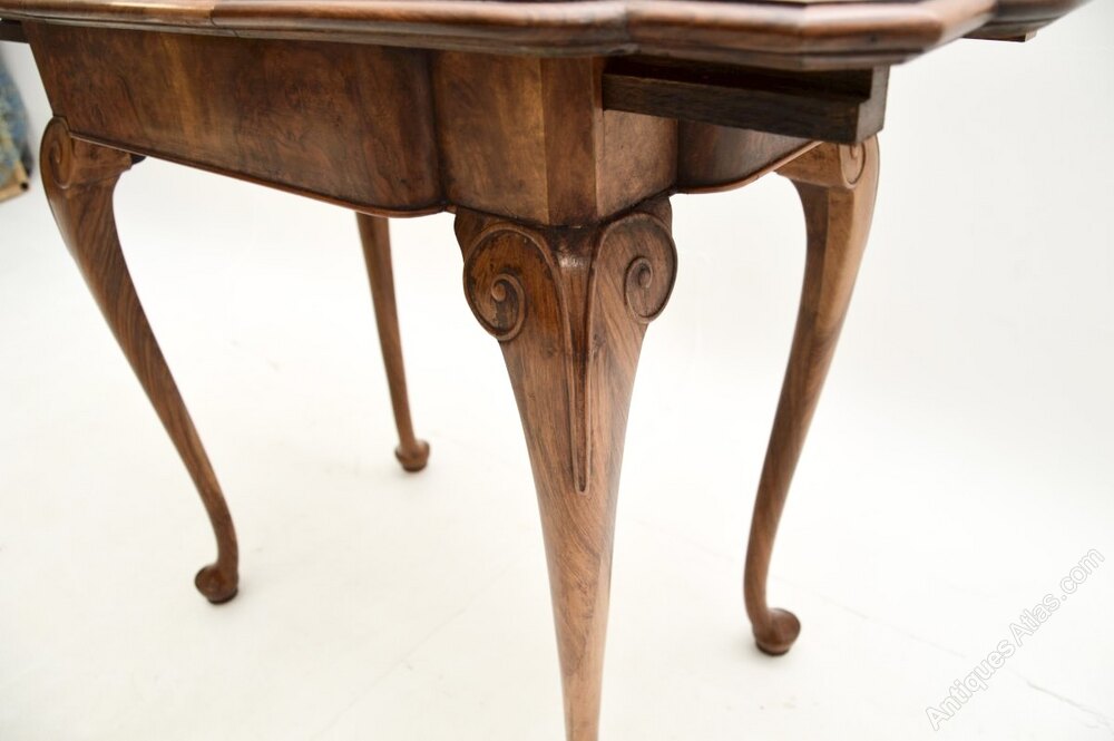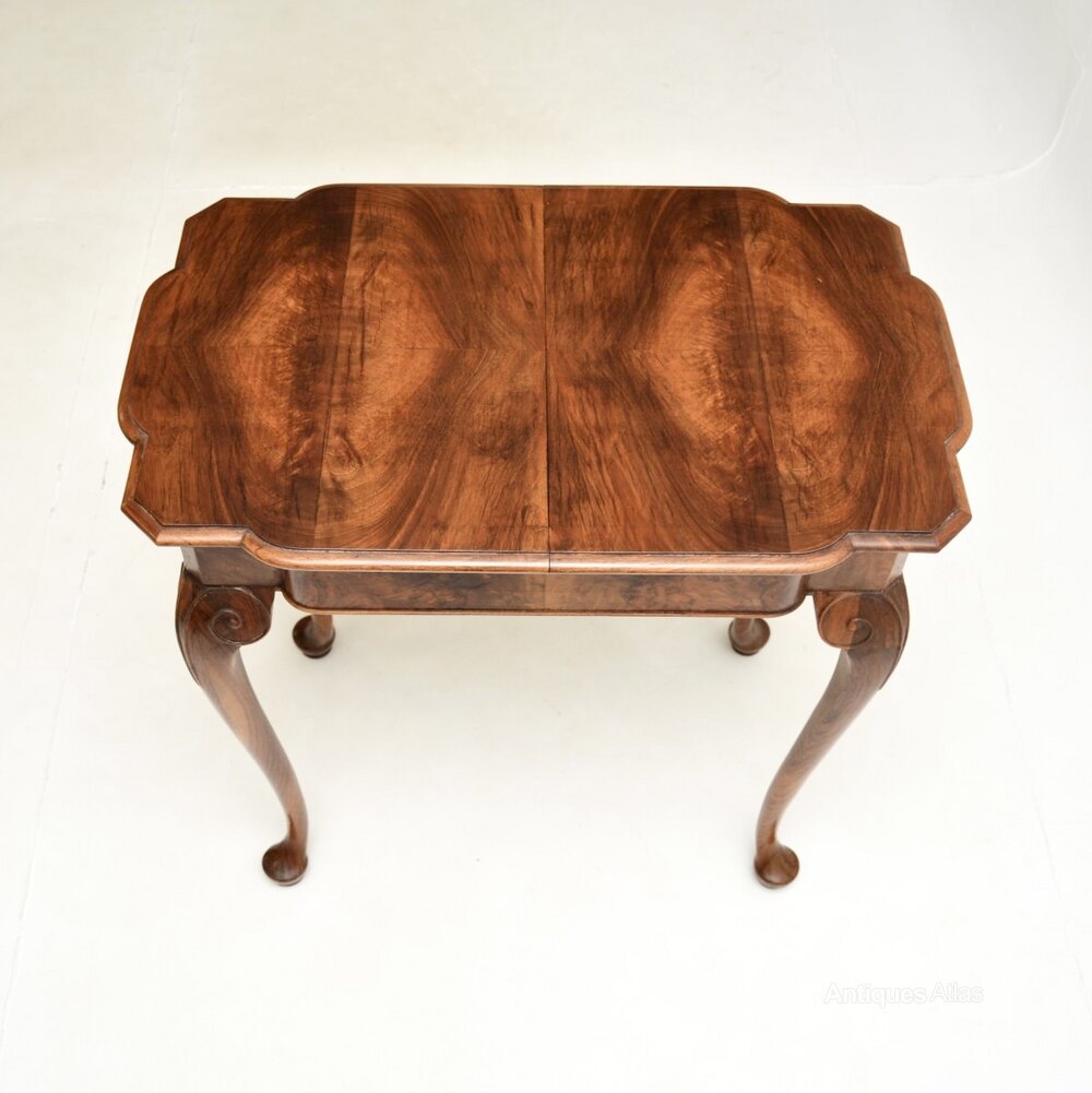 It is of superb quality and is a useful size. The table drawers apart in the middle and there is an extension leaf that is stored beneath the top, that slots in and extends the surface area. This has beautiful walnut grain patterns, it stands on cabriole legs and has scrolled carving at the knees.