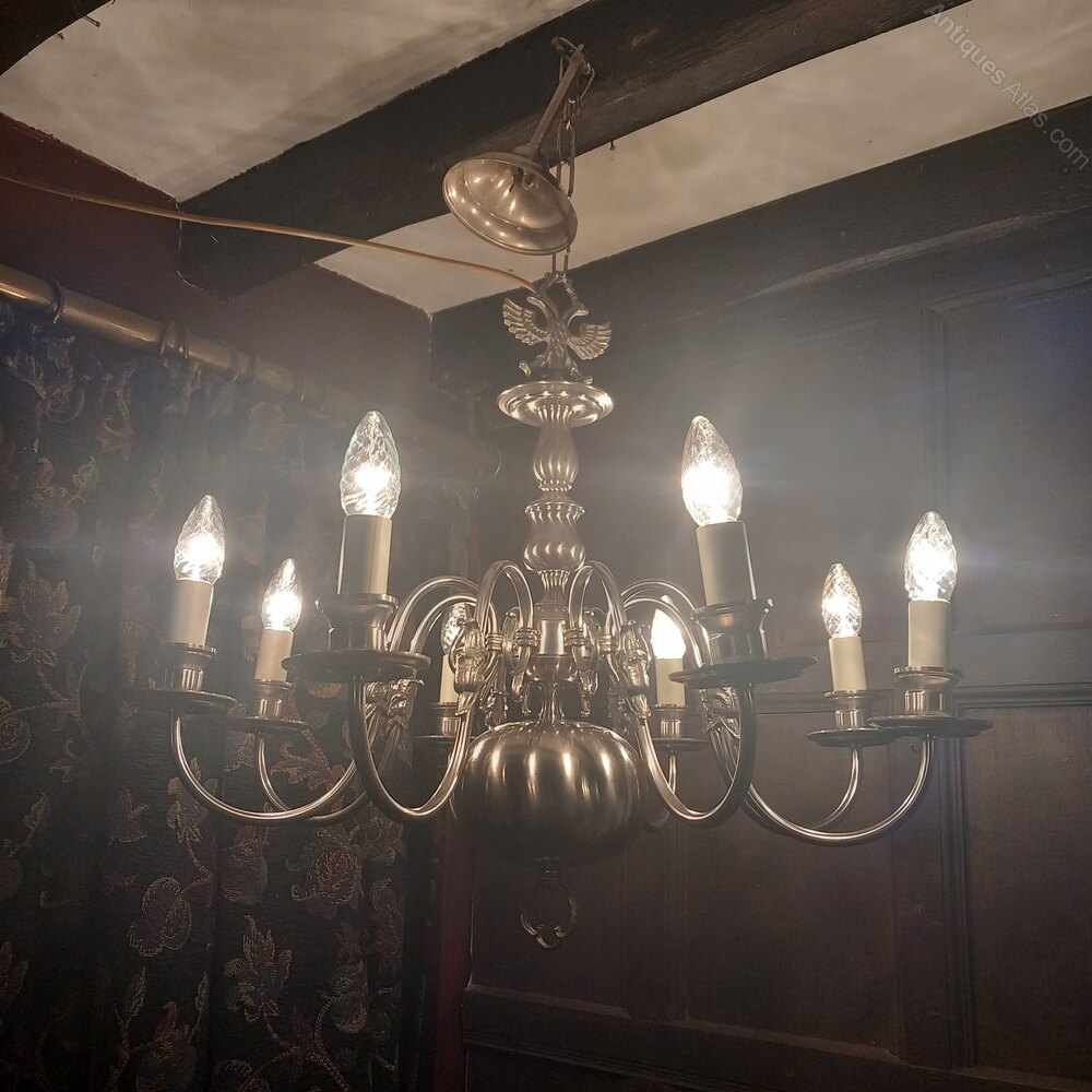 A lovely medium size 8 light nickle plated Flemish chandelier.