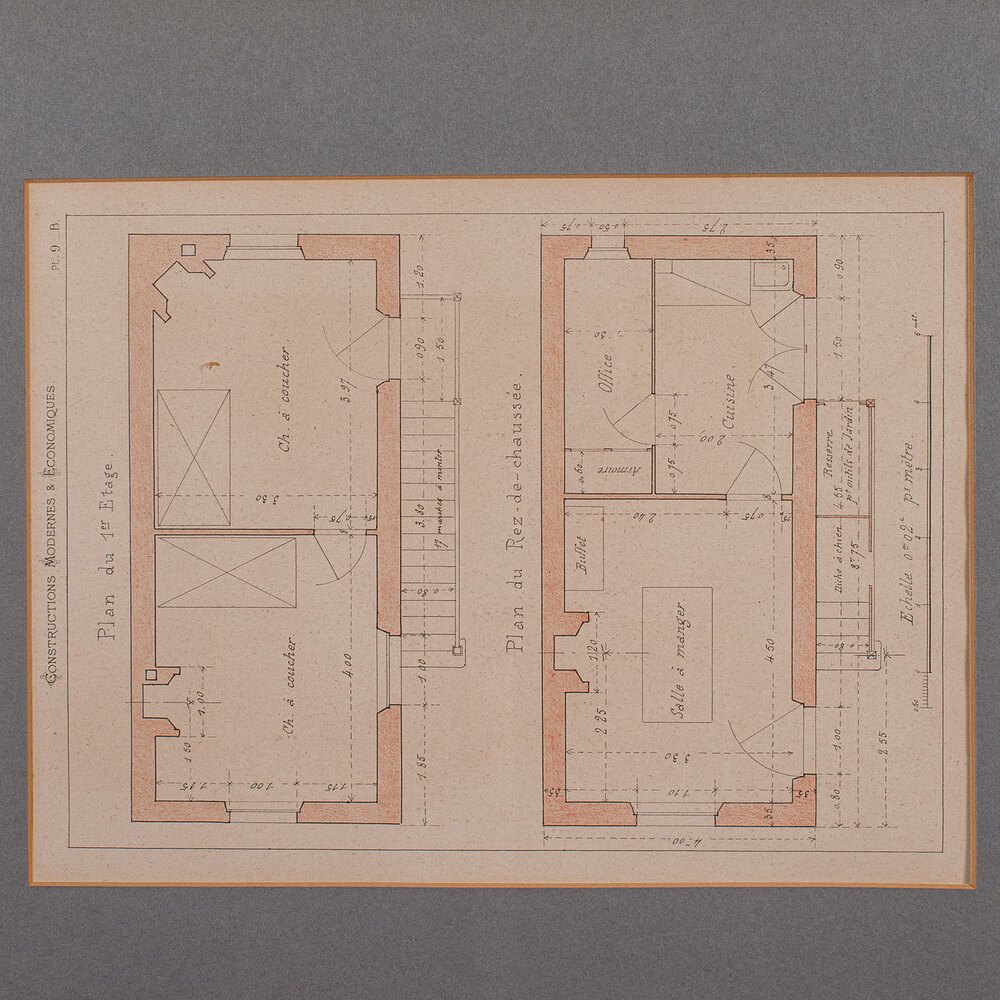 This is an antique framed architectural plan. A French, lithograph set of drawings from Constructions Modernes et Economiques, dating to the late Victorian period, circa 1900.