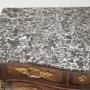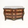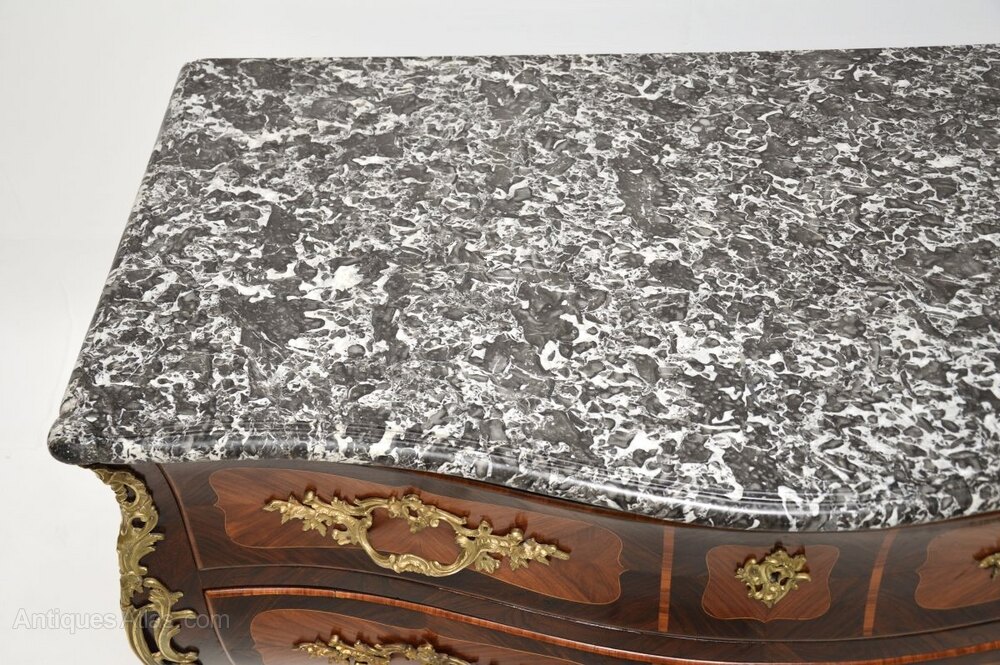 It is of magnificent quality with a beautiful design and generous proportions. There is stunning inlaid marquetry of various woods and extremely high quality gilt bronze mounts all over. This has a curvaceous bombe shape with a serpentine front edge. The marble top is likely original, it is very thick and is a lovely speckled grey.