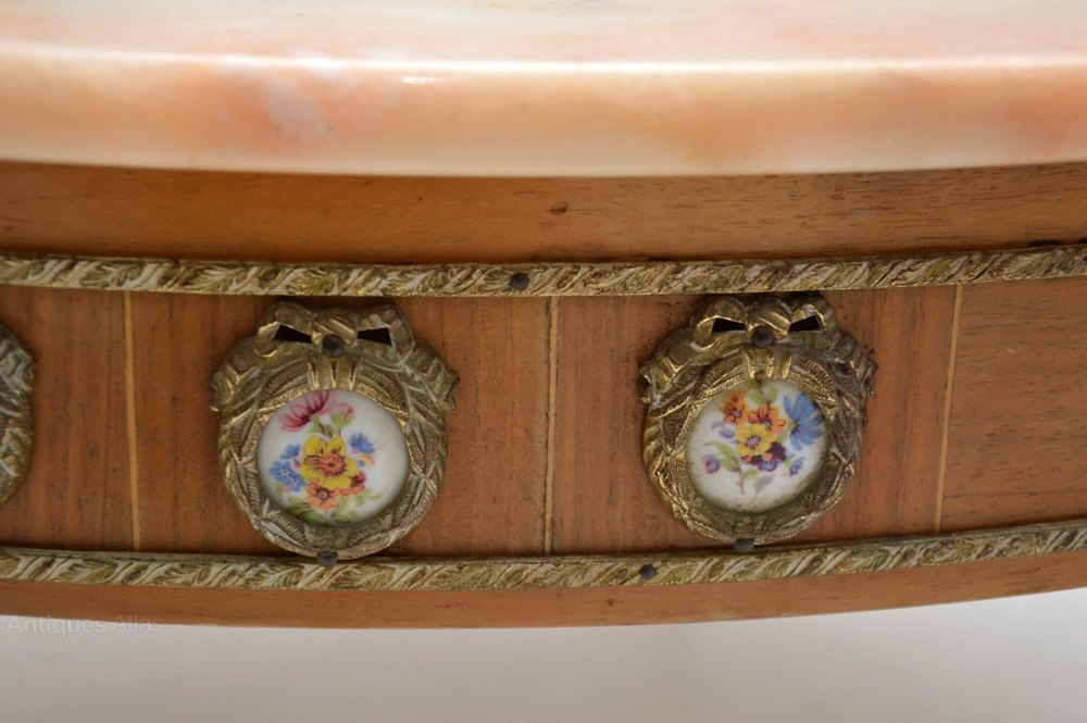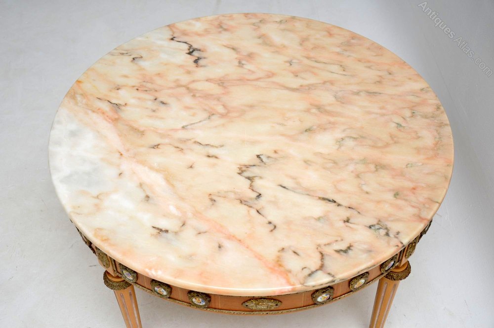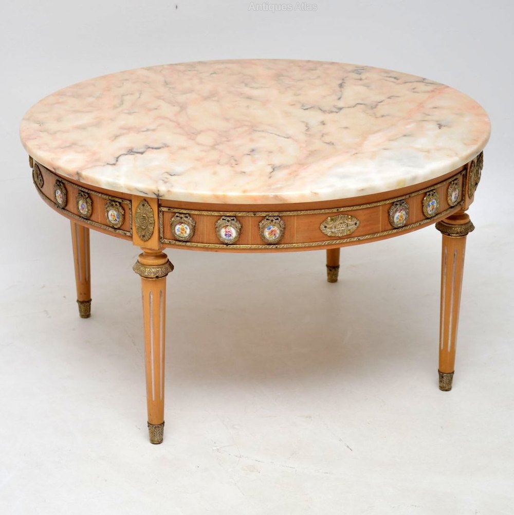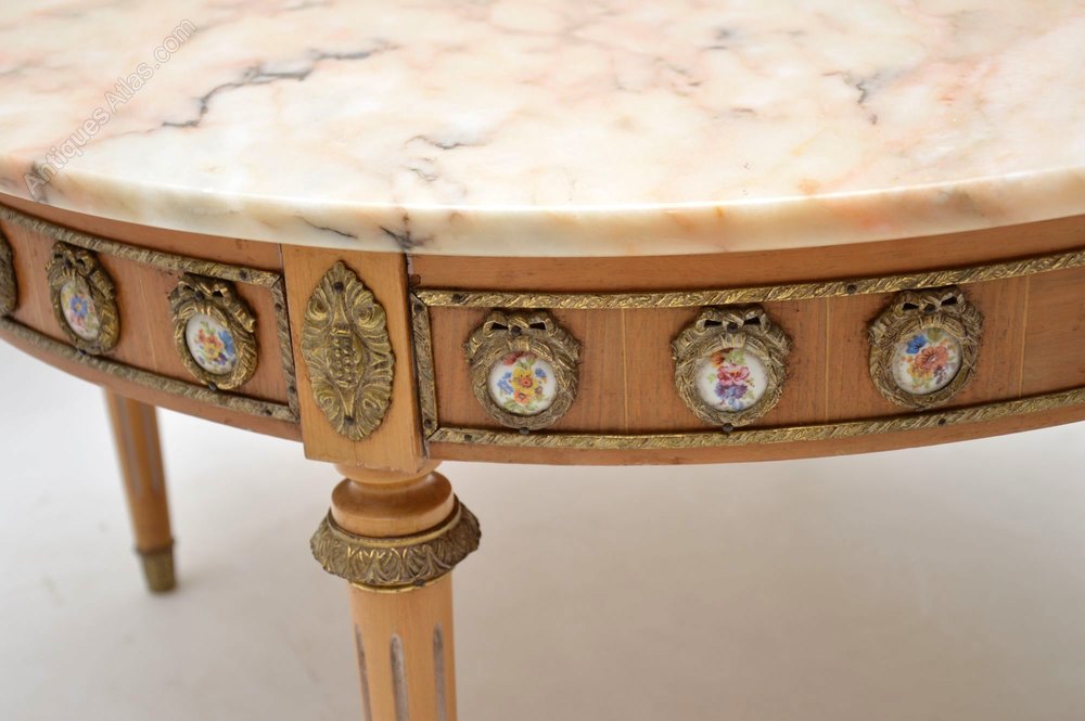 This antique French style marble top coffee table is in good original condition & I would date it to around the 1930-50’s period. It has gilt metal mounts all around the top edge, with more down the fluted legs & the feet are gilt metal too. There are also many exquisite painted porcelain plaques encased in gilt metal laurel wreaths all around the top edge. I think the wood is mahogany & walnut, with a slightly bleached effect.