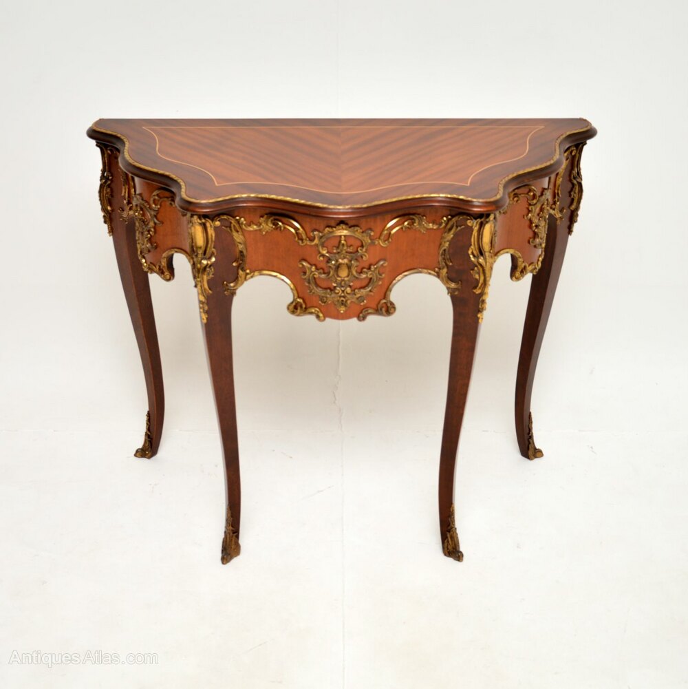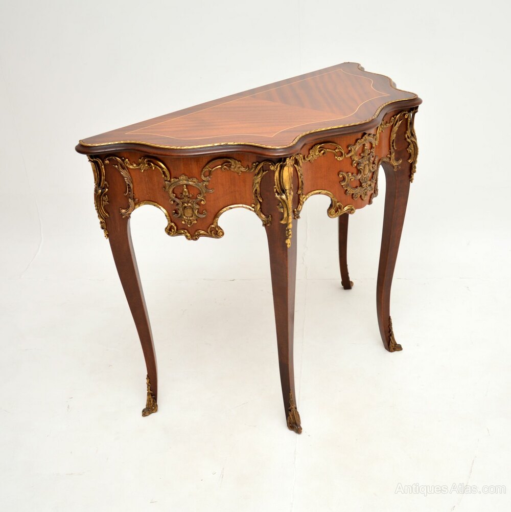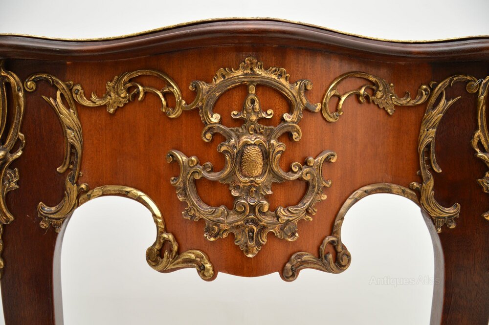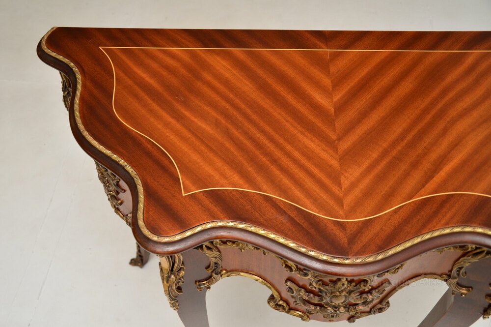 We have recently had this re-polished, the condition is excellent for its age. We also have a near identical second table to make a pair if required, the only difference being the other has inlays on the front edge behind the ormolu. Otherwise they are identical in shape, size and with identical ormolu mounts.
