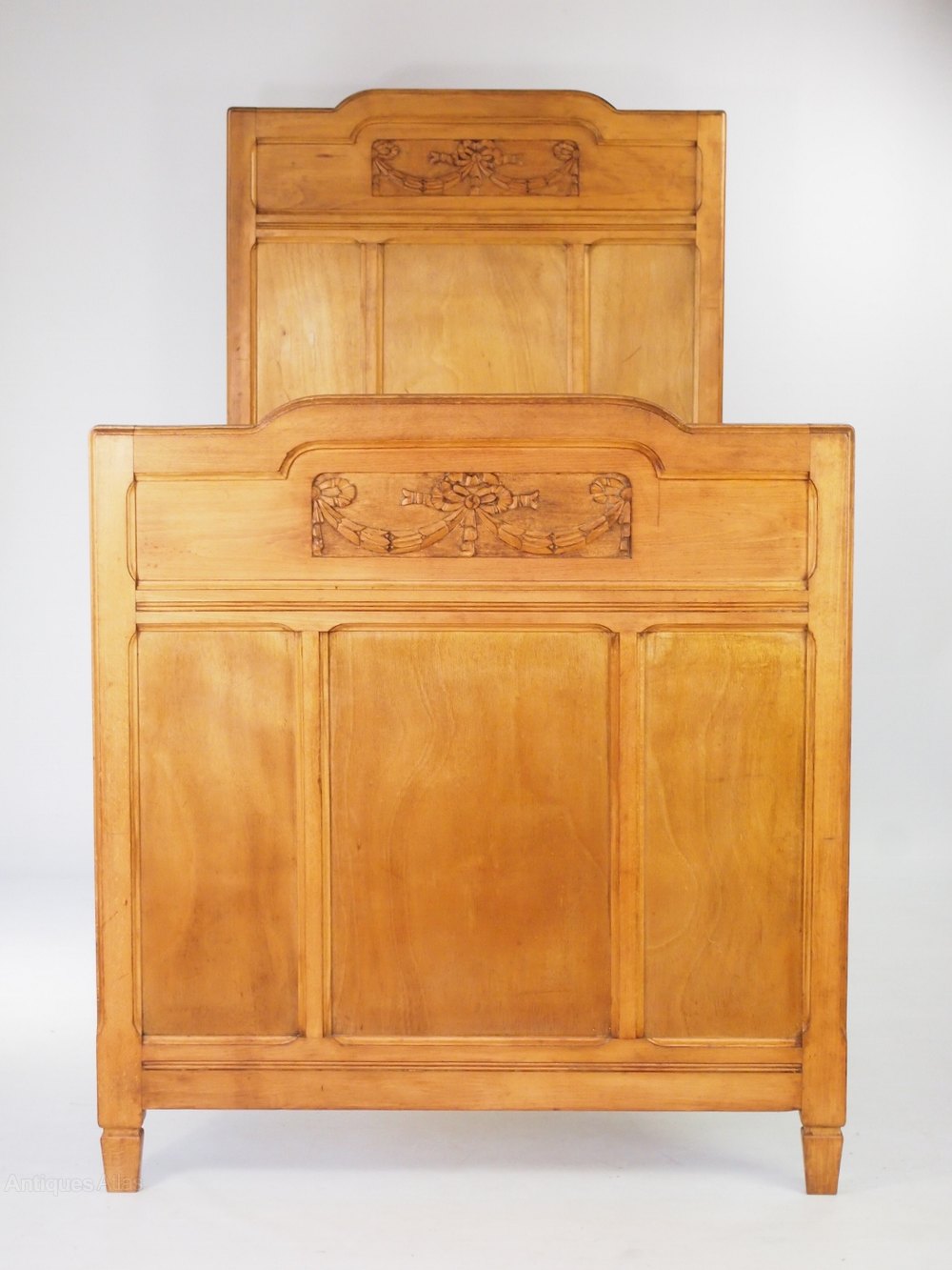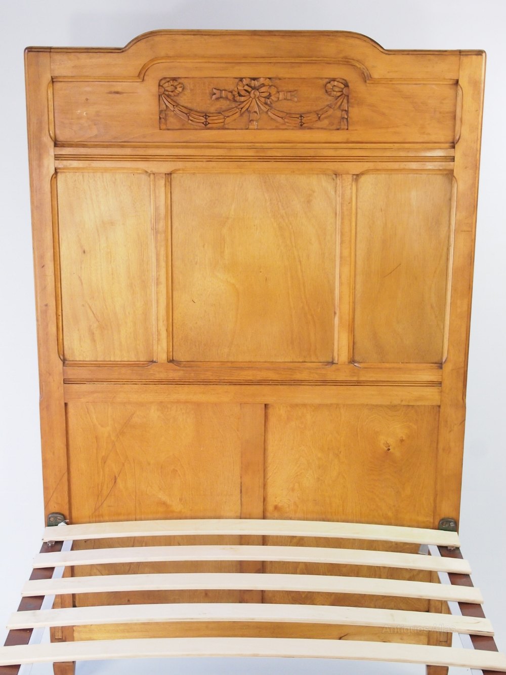 A stylish antique French single bed (3FT x 6FT3) dating from circa 1900. It is a standard single size bed 36 inches × 75 inches and comes with a slatted base. It has a very tall panelled headboard and footboard with swag and ribbon carving. It can be assembled or dis-assembled for storage. Just add a mattress (sorry no mattress supplied).