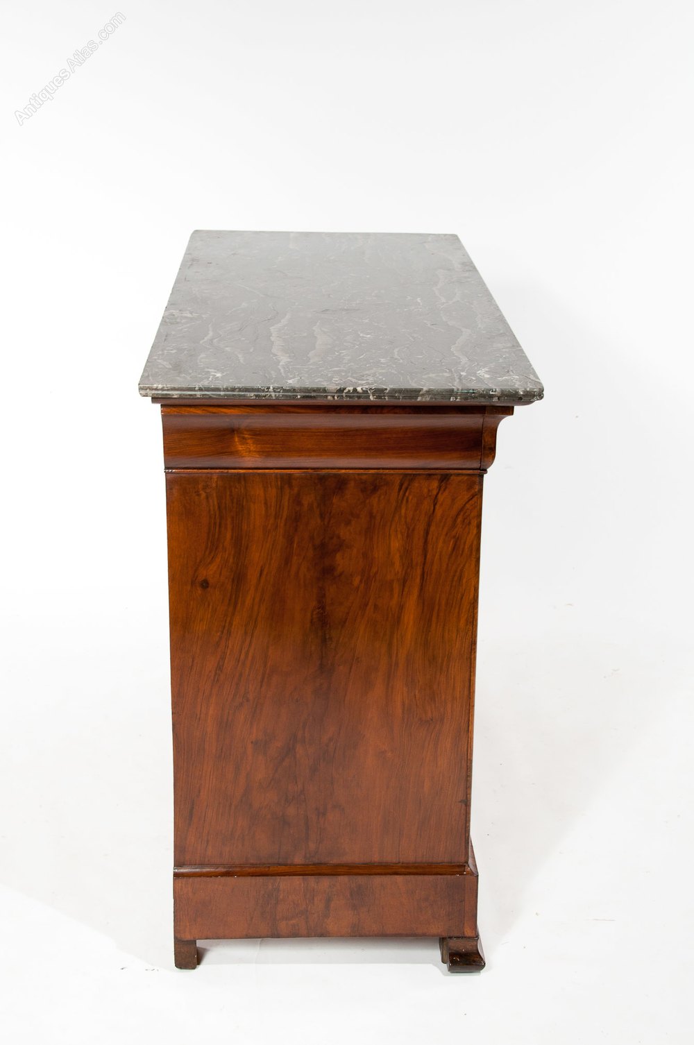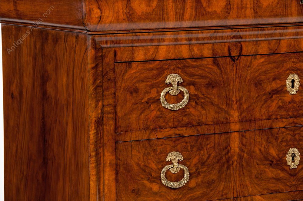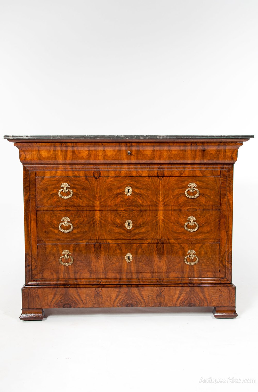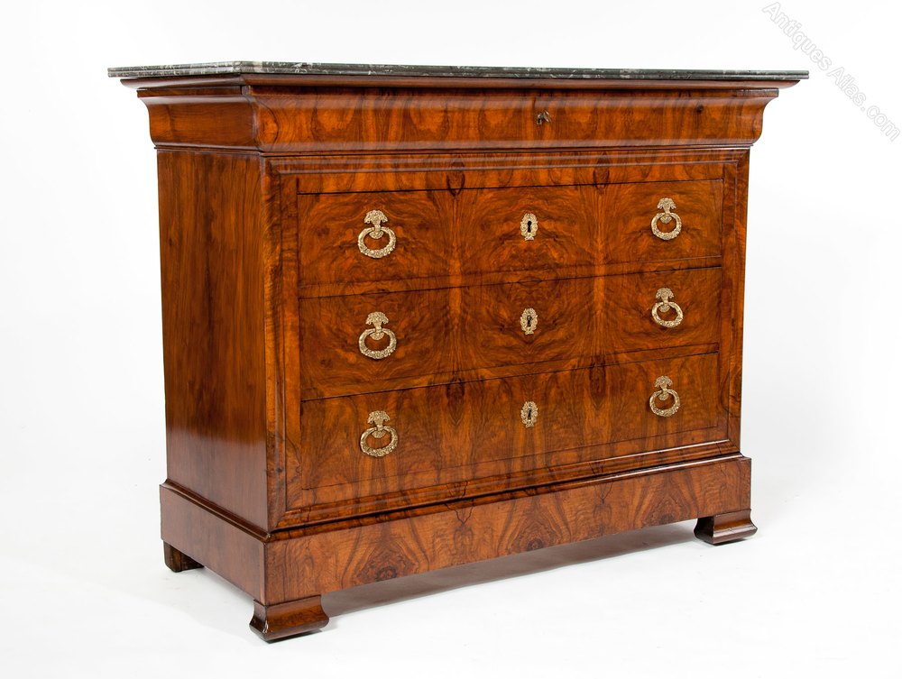 An exceptional quality grey marble topped French Louis Philippe figured Walnut 4 drawer Commode. This Antique commode has a beautifully white veined grey marble top above a shaped walnut oak lined cushion top drawer and central brass inset escutcheon. Below this are three beautifully grained figured walnut drawers set within a shaped moulded edge again with central locks and ornate brass plate escutcheons being flanked by brass handles oval ring pull handles.