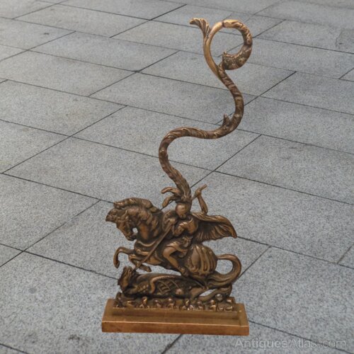 A fine English antique cast brass doorstop modelled as George and the Dragon. Manufactured by Pearson Page of Birmingham circa 1910. Completely untouched and never been polished. Original weight in the base. Superbly cast and well detailed. 16" tall x 8" wide x 1 7/8" deep. Weighs 3.76 kilos.