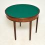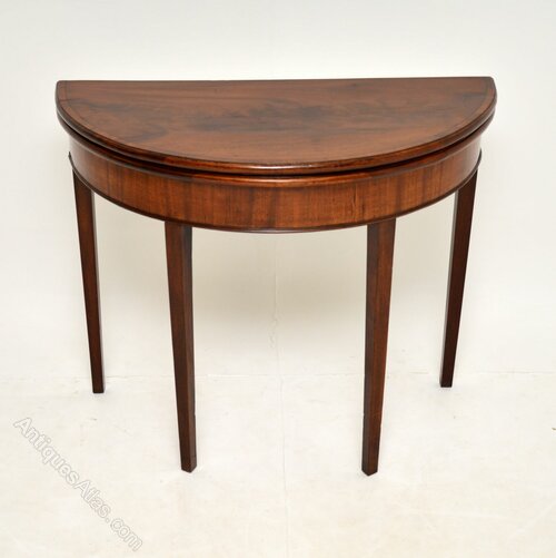 It has a beautiful design and is a very useful shape. When closed it is perfect for use as a demi-lune console table. When opened it turns into a lovely circular card table which seats four. The back leg swings out to support the playing surface.