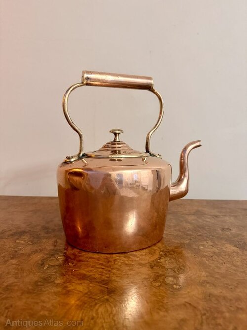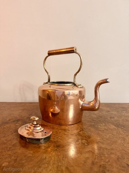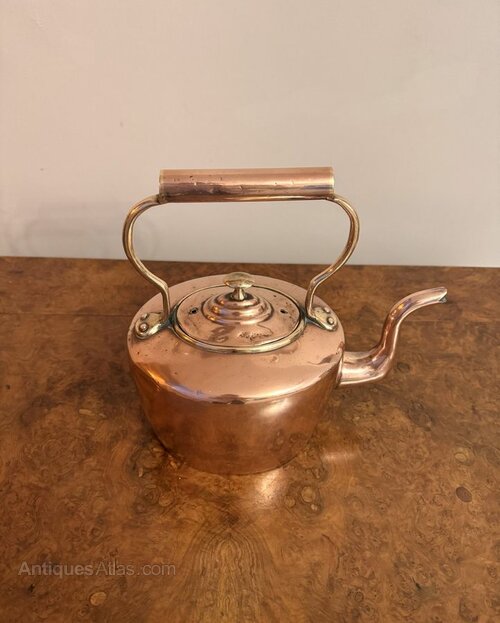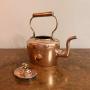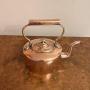 Quality antique George III small copper kettle, having a quality copper kettle with a removable lid with the original brass knob having a shaped handle and spout.