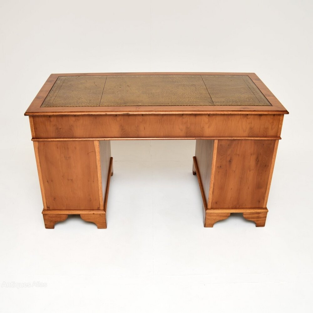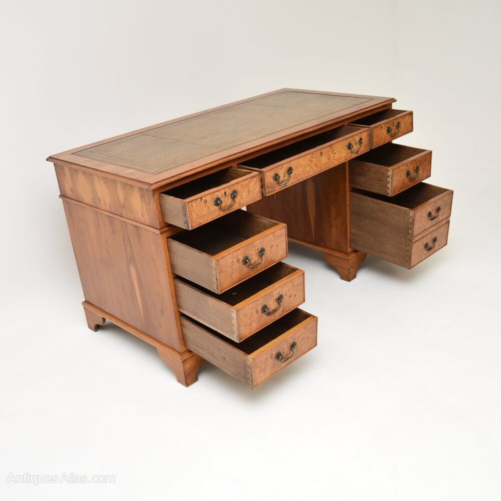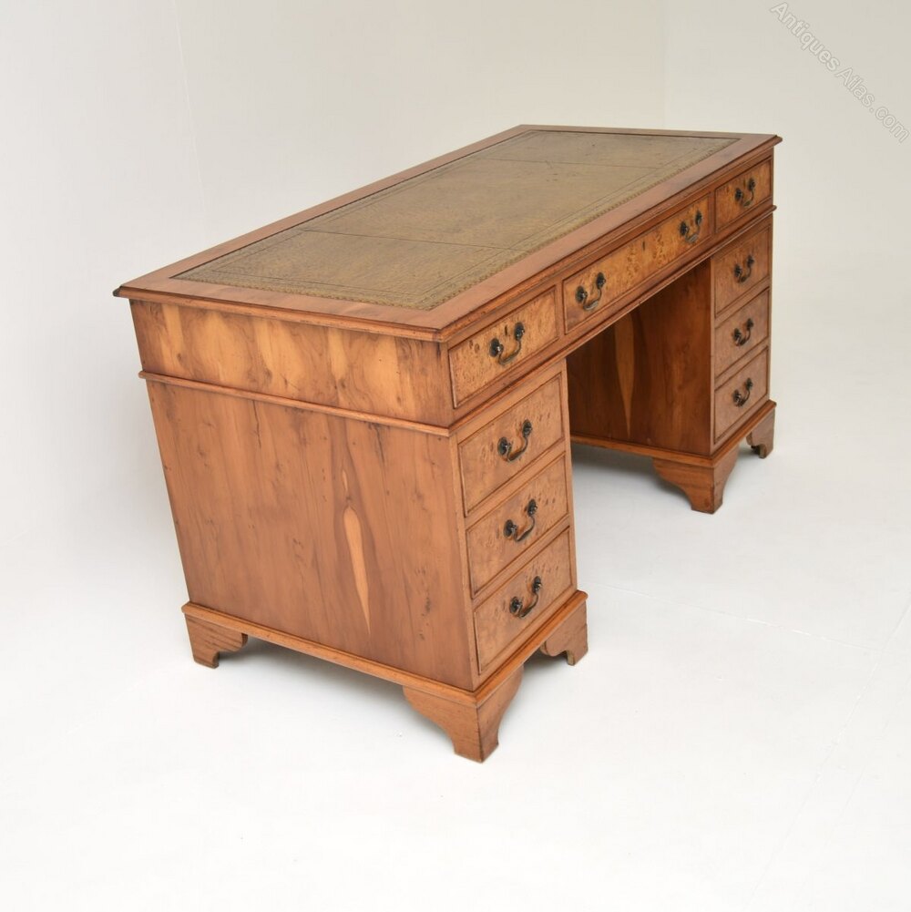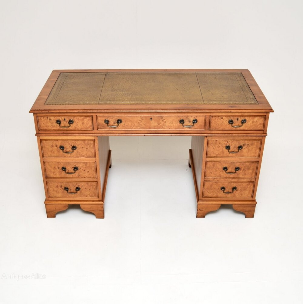 A smart and very well made antique Georgian style burr yew pedestal desk. This was made in England, it dates from around the 1950’s.