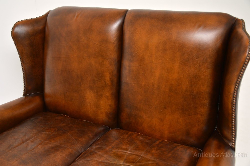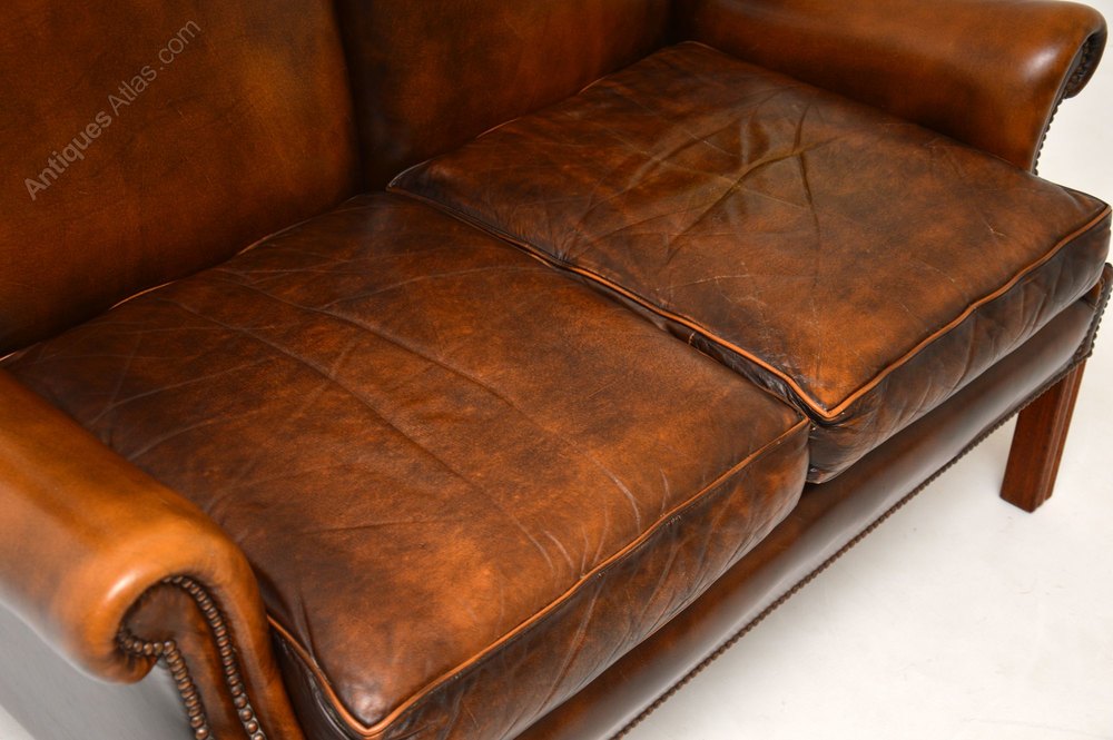 The leather is hand tacked onto the frame. There are two loose cushions & it sits on sturdy mahogany legs.