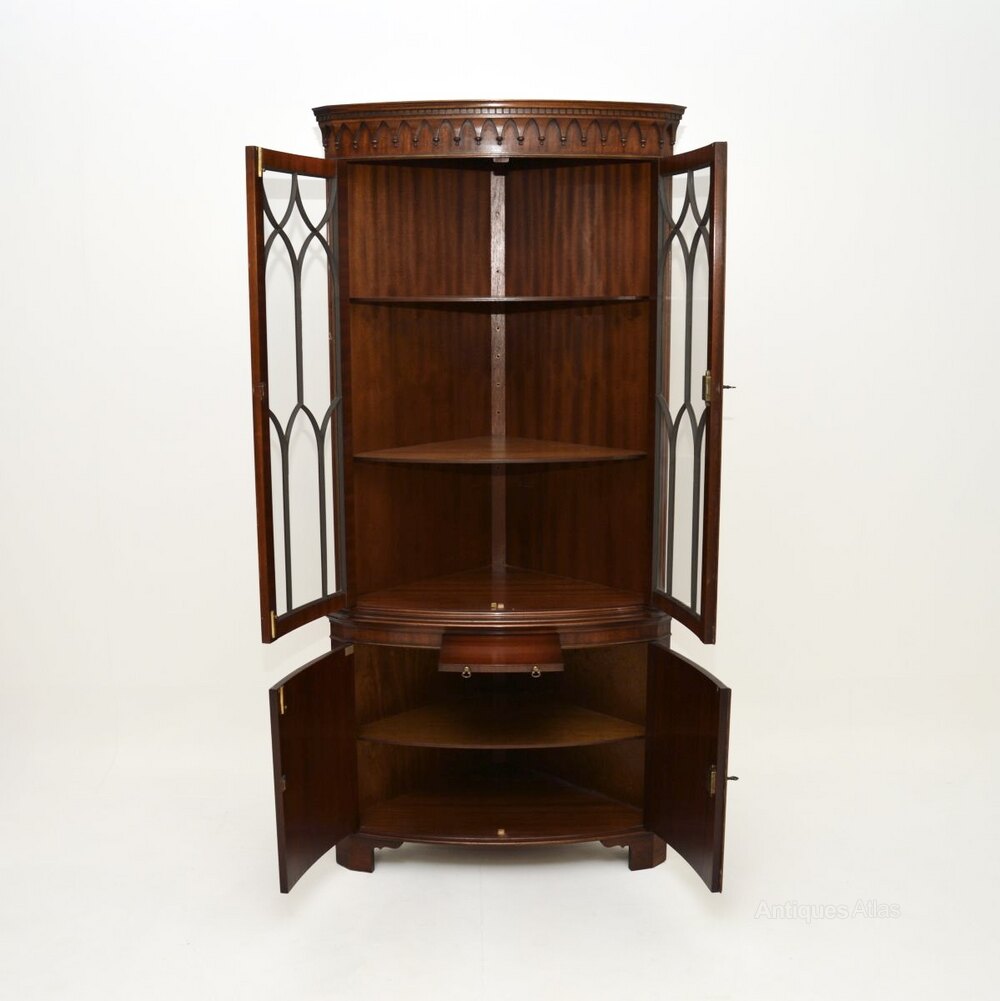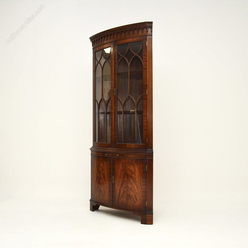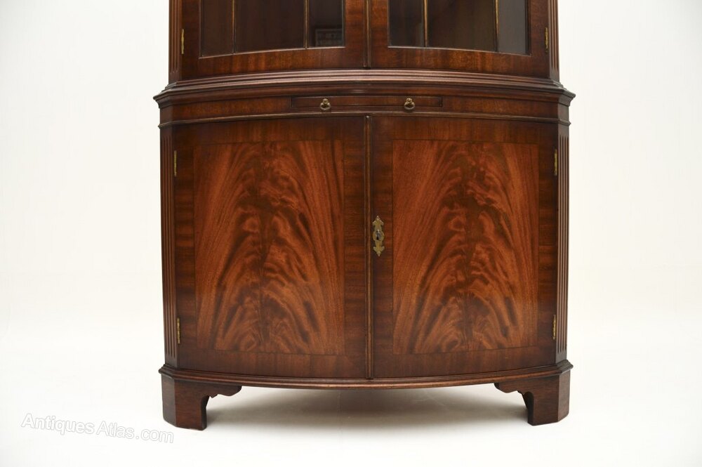 A very impressive antique Georgian style mahogany bow front corner cabinet. This was made in England, we would date it to around the 1950’s period.