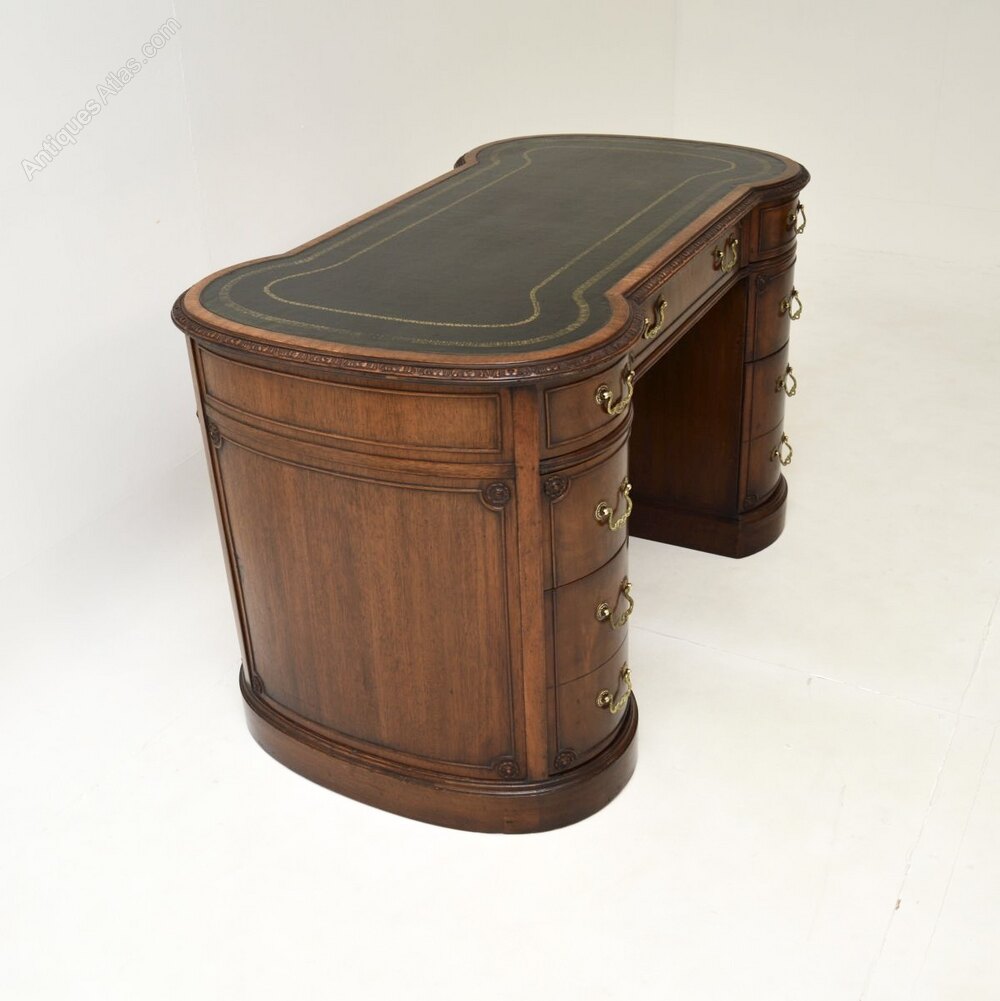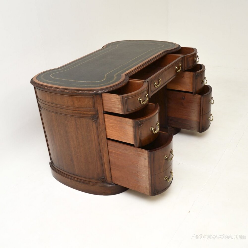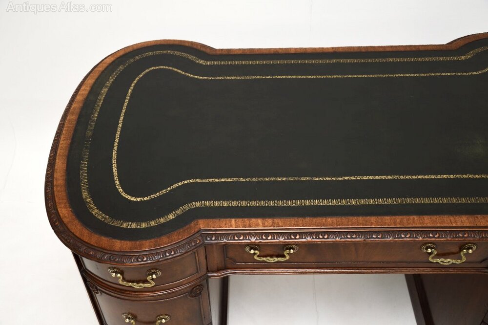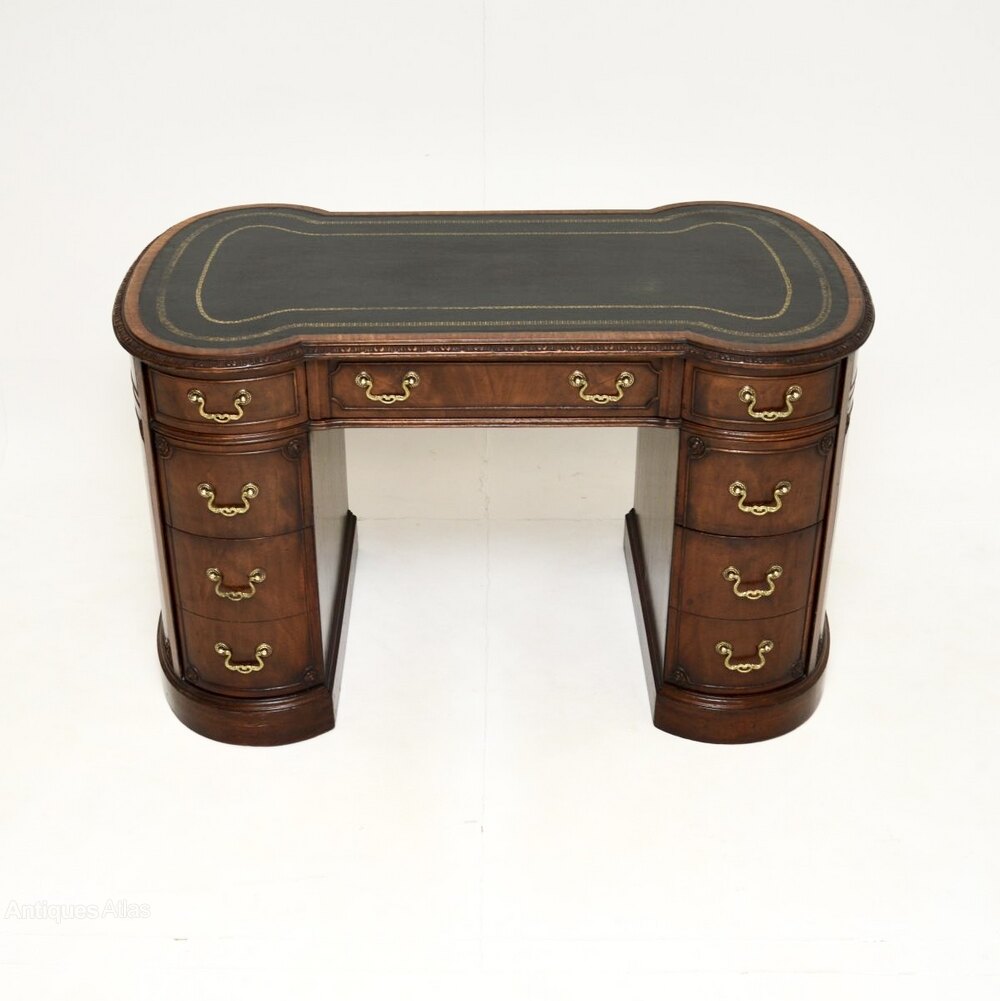 It is of very fine quality and has a superb design, with an inverted breakfront shaped front and back. The fronts and sides are panelled with carved rosettes at the corners, the top also has lovely carving around the edges. The inset leather writing surface has gold tooled edges, the drawers have fine quality brass handles and lots of storage space within, with double depth drawers at the bottom on both sides. The back is nicely finished, so this can be used as free standing item.
