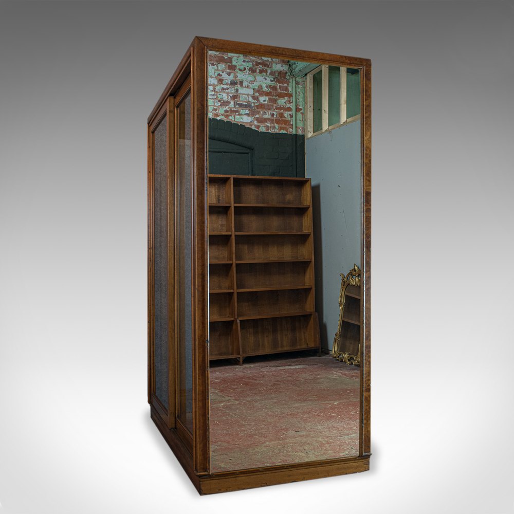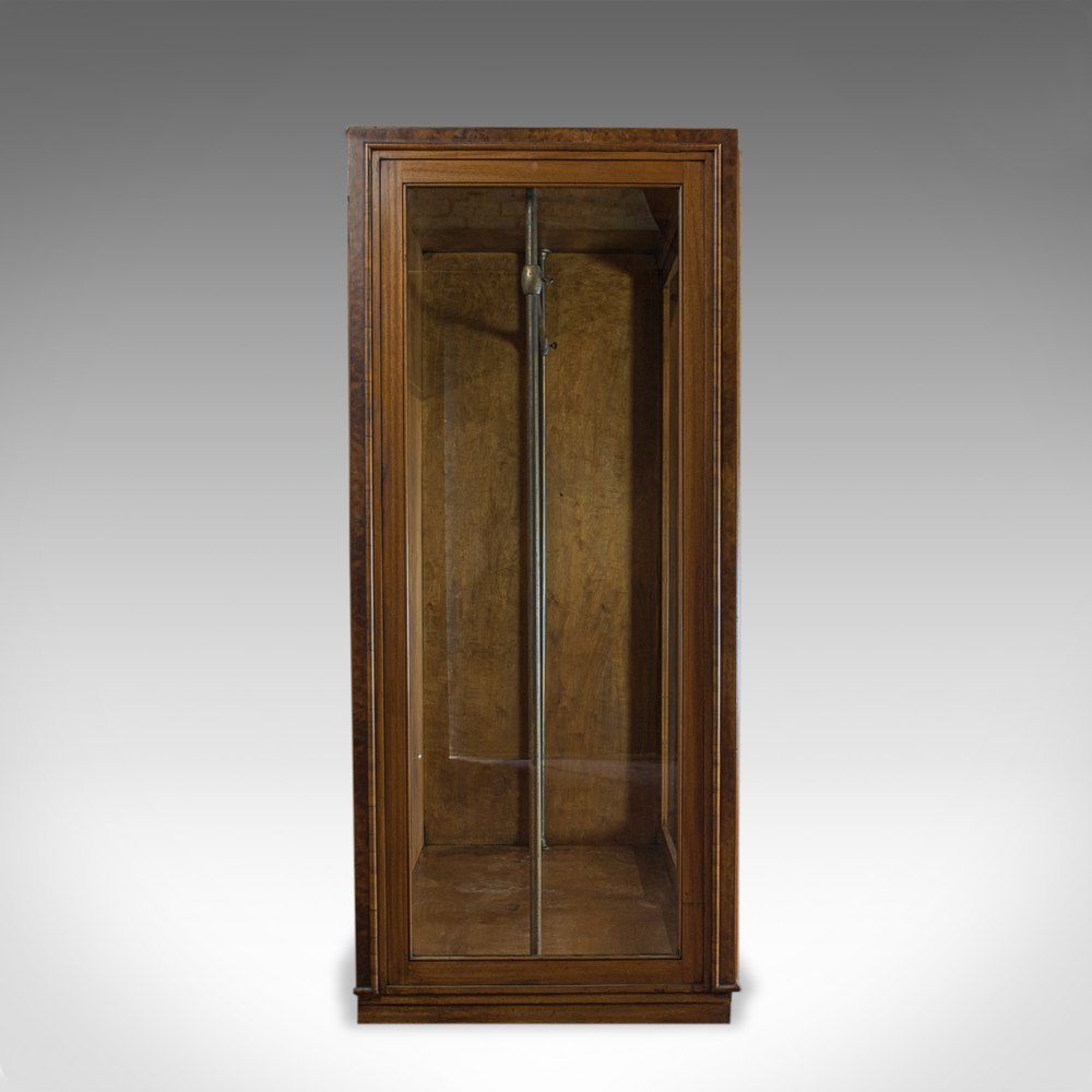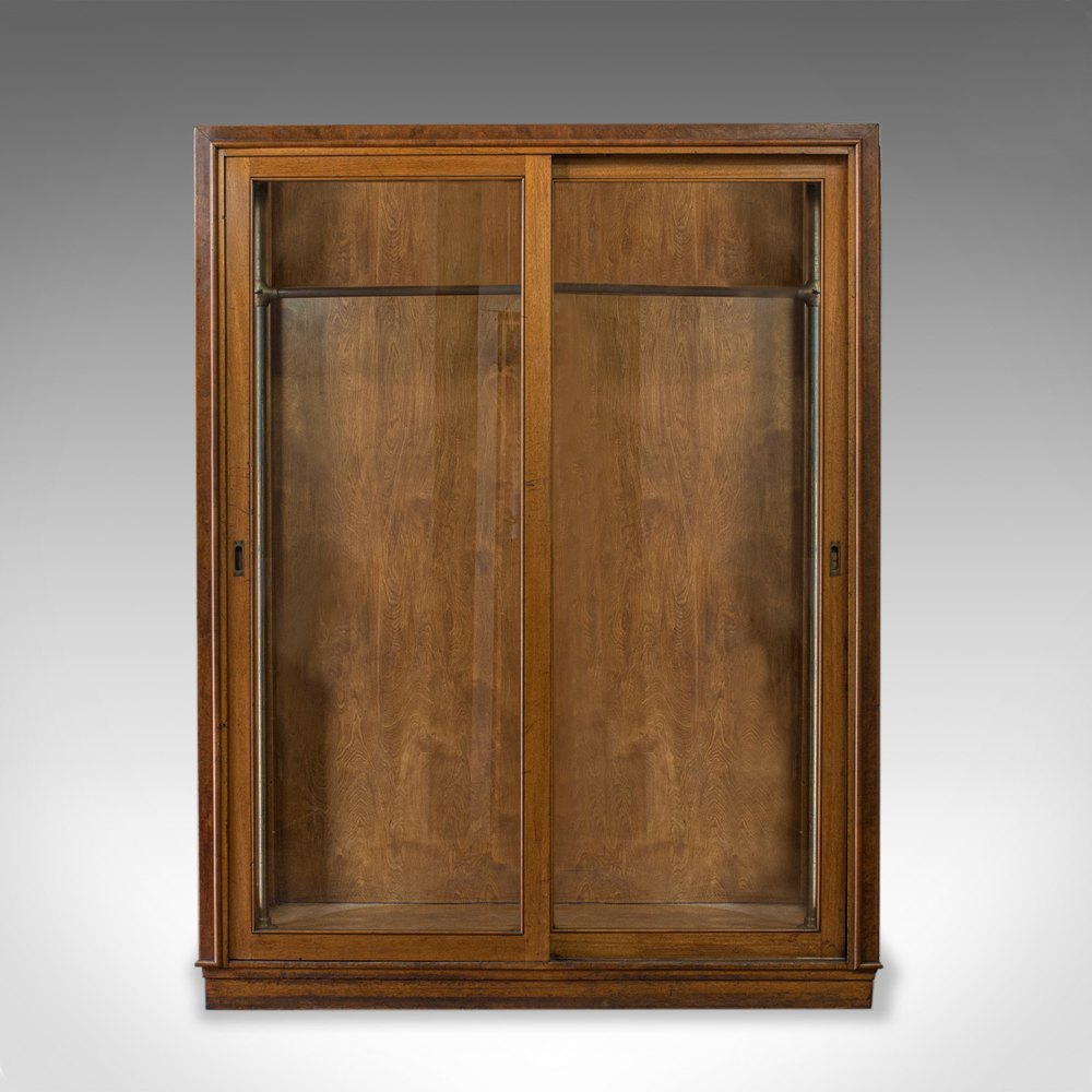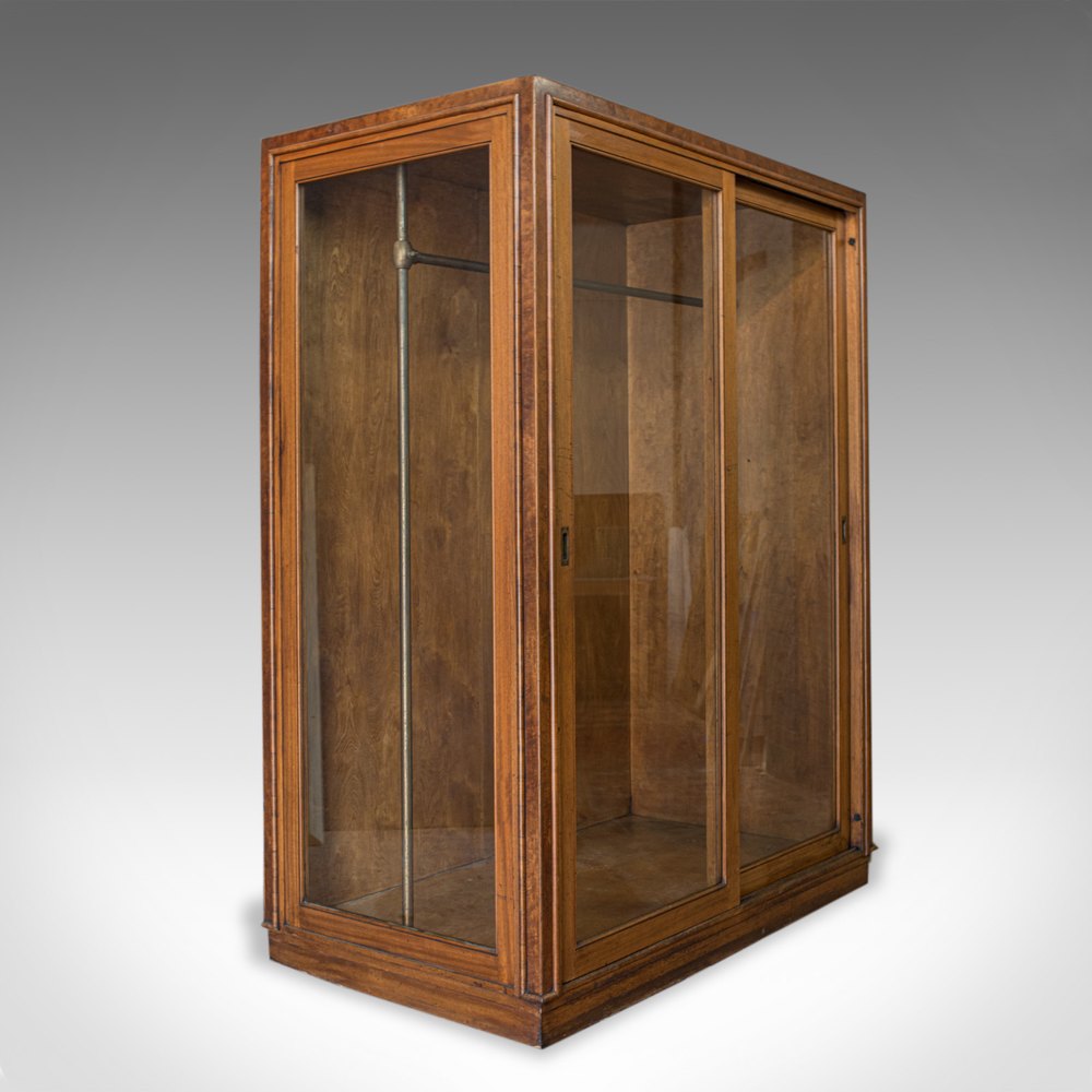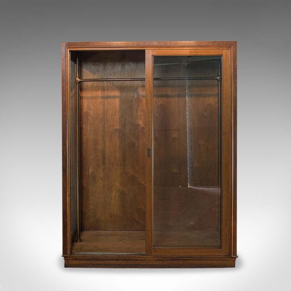 This is a large, antique glazed wardrobe cabinet by a renowned shopfitting concern. Solid joints and construction, delivered waxed, polished and ready for the home or commercial environment.
