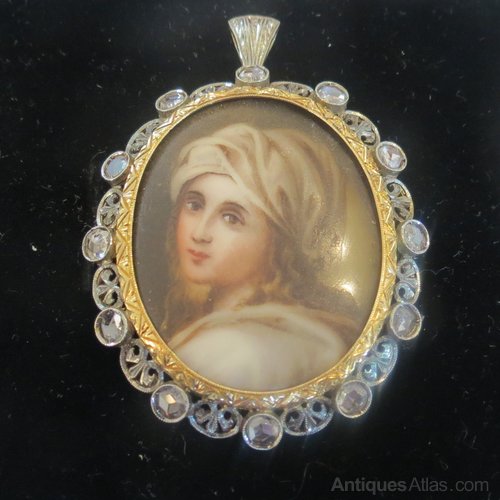 Antique gold and diamond portrait brooch. Simply beautiful - a 19th or early 20th century, hand-painted porcelain portrait miniature pendant/brooch in a high-carat white and yellow-gold (unmarked t/a 18ct) mount in a border of 12 old-cut diamonds interspersed with fleur-de-lys on with a finely chased white gold bale with secured pin and closed back. The craft of the jewellery itself is remarkable, but the quality and beauty of the painting is simply stunning.