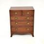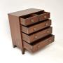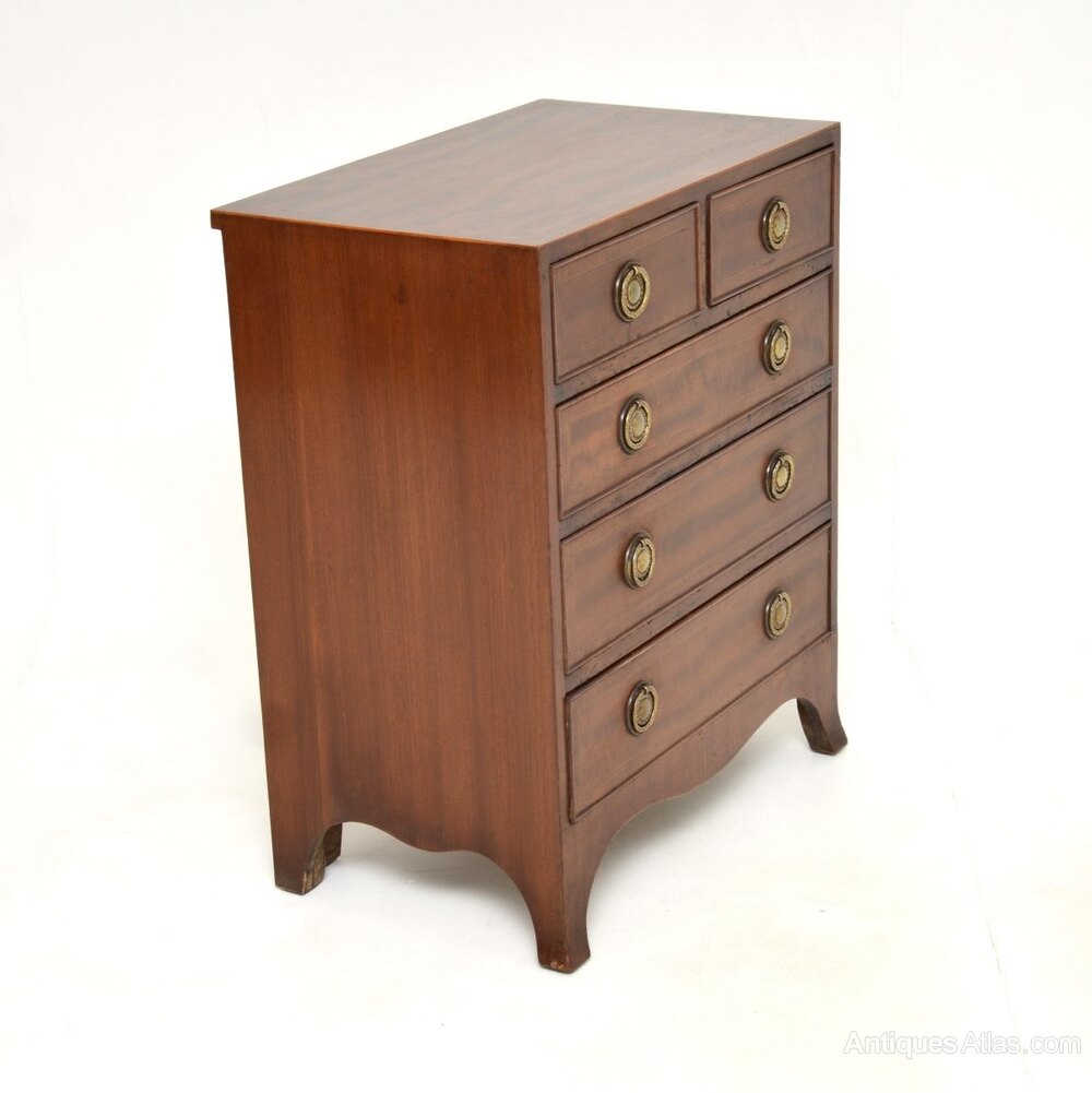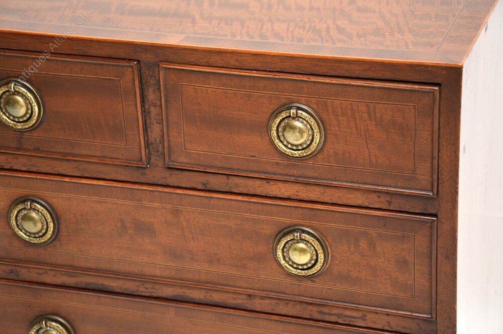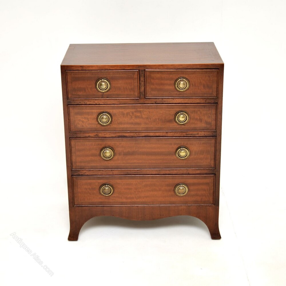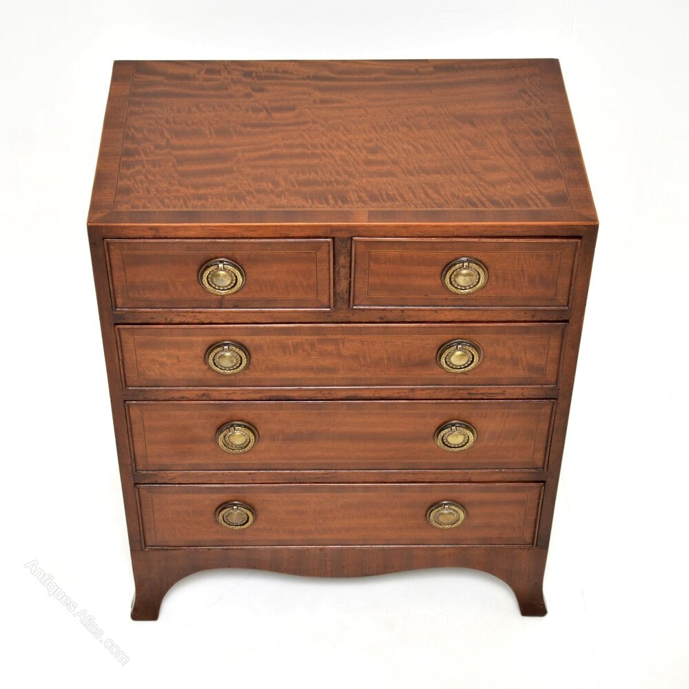 It is of very fine quality, it is a very useful smallish size and has a beautiful design. It sits on splayed bracket feet, has lovely brass handles and gorgeous inlaid satin wood around the cross banded top and drawer fronts. The drawers all run smoothly, this has lots of storage space. The mahogany has an absolutely gorgeous colour tone and patina.