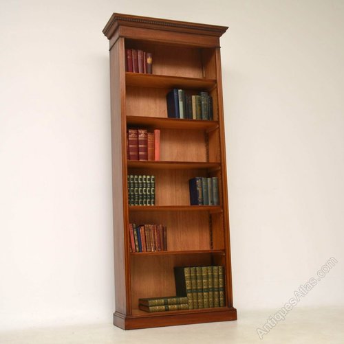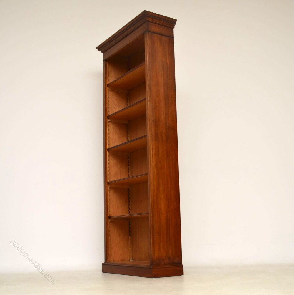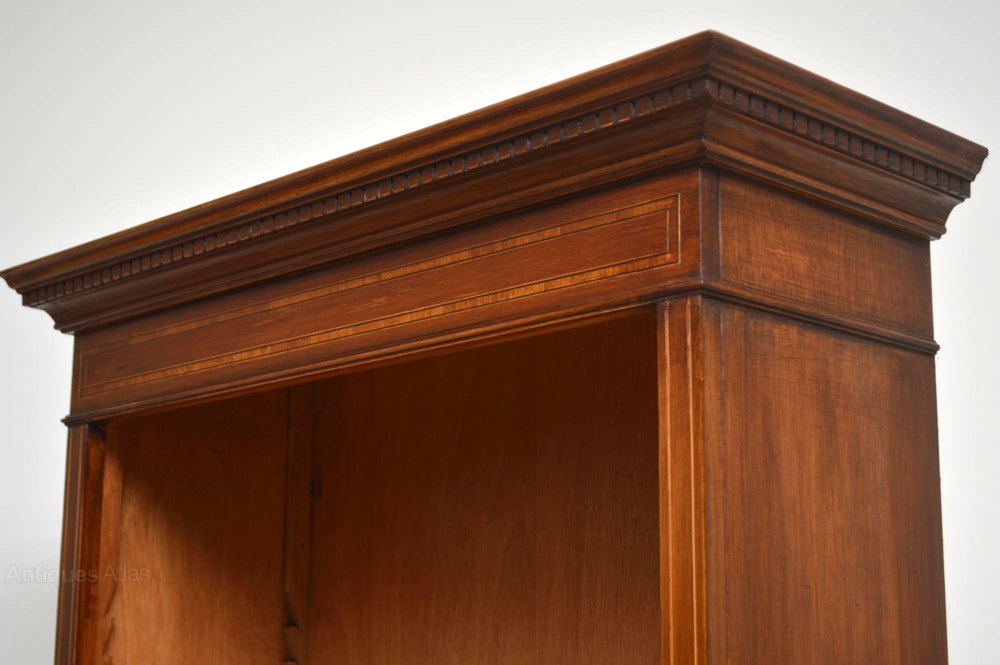 Tall antique Sheraton style open bookcase in mahogany with satinwood inlays. It has five shelves with reeded fronts that are all adjustable on sharks teeth supports. The top cornice has dental mouldings below & this bookcase sits on a plinth base. It’s in perfect condition, having just been polished & dates from around the 1950-60’s period. This bookcase has just been hand polished & retains a lot of character.