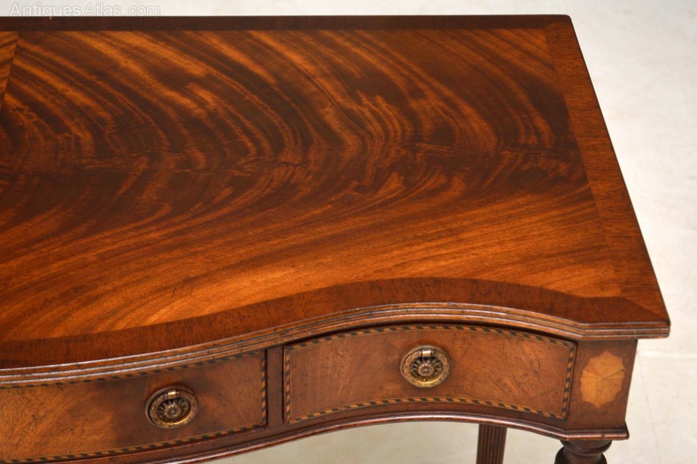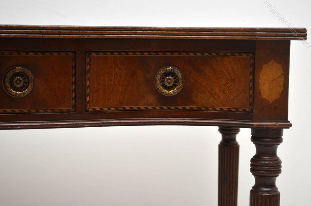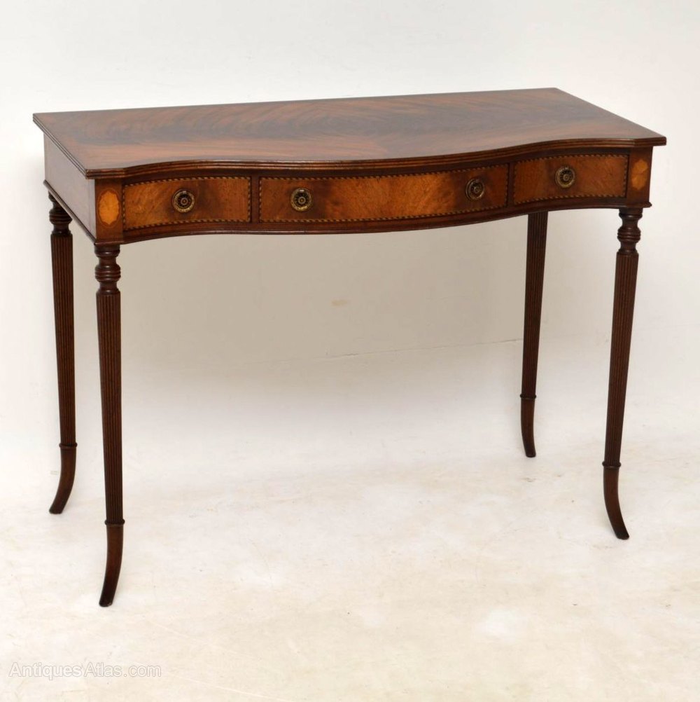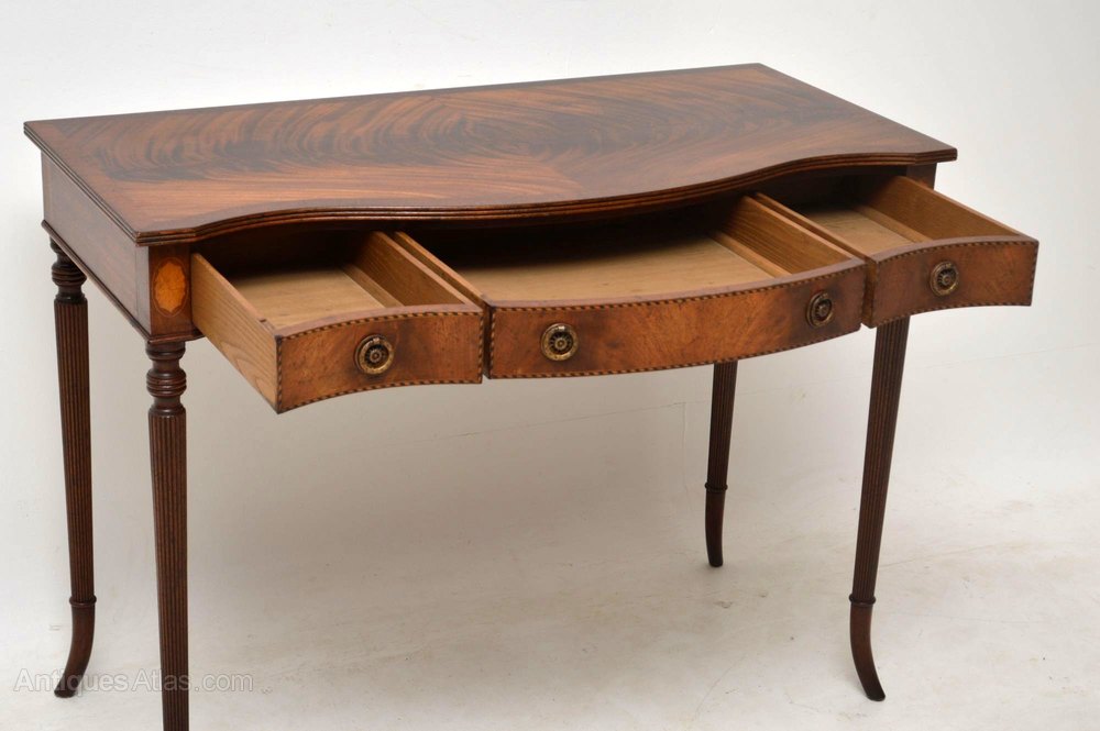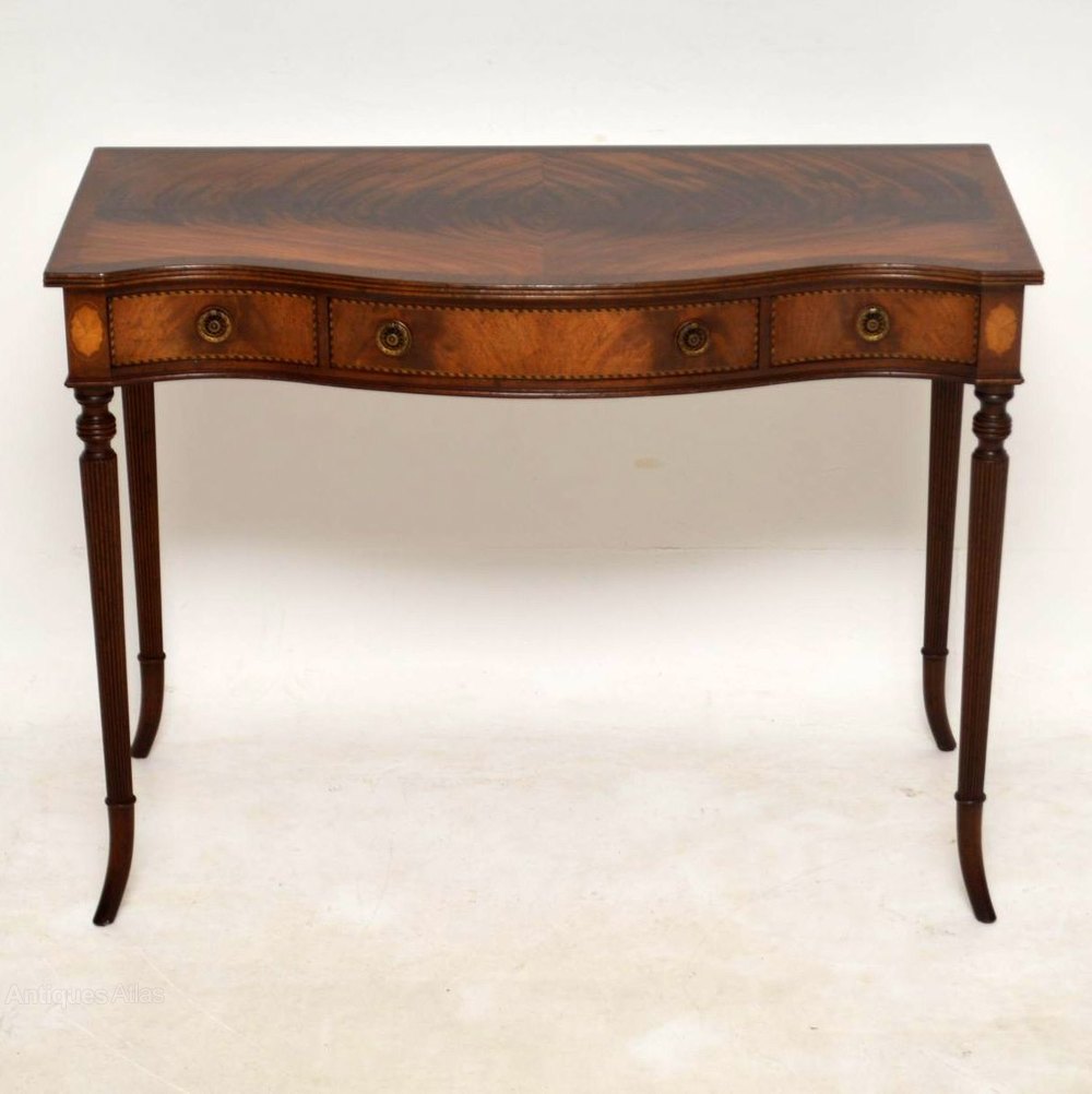 This elegant antique mahogany side table is of very high quality & has a wonderful shape with many fine features. The top section is serpentine shaped with flame mahogany, cross banding & a reeded edge. There are shell inlays on either end of three drawers that are inlaid around the edges with original brass handles. The drawers are lined with solid timbers & have fine dovetails. The turned reeded legs taper & kick out at the ends. This table could be used as a small desk or a side table. It’s in excellent original condition & I would date it to around the 1910 period.
