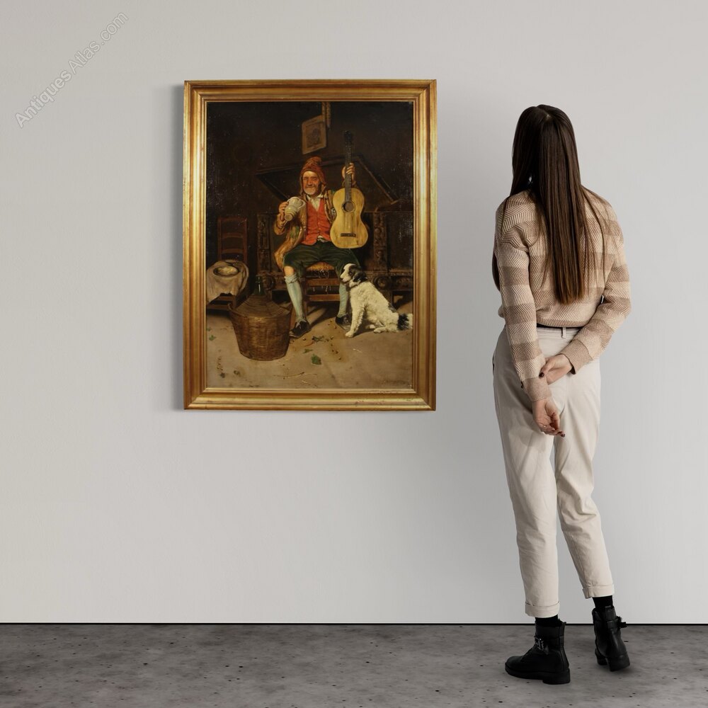 Antique 19th-century Italian painting. Oil on canvas artwork depicting a man in a tavern with a dog, well-crafted. A finely sized and attractively decorated painting, signed lower right (see photo), attributed to the painter Federico Alessandro Ciappa (1766-1826). Authentication is missing. This vertically arranged painting is enriched with numerous details (see photo). It is suitable for antique dealers and collectors.