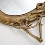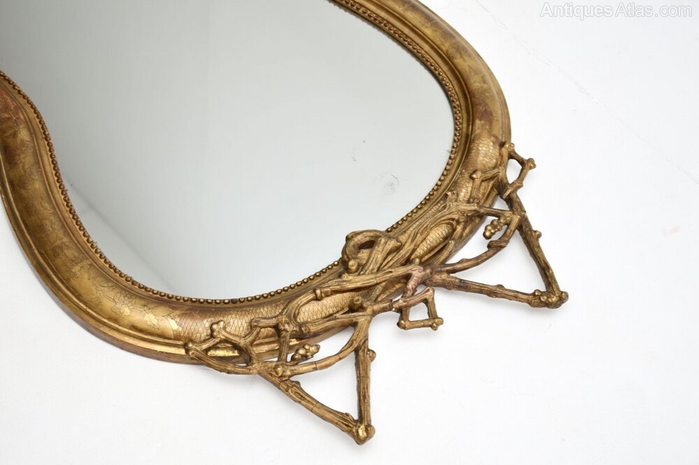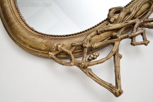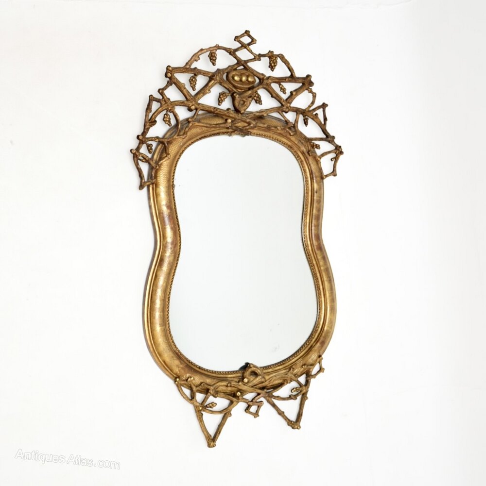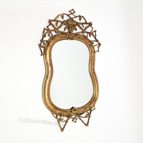 It is of superb quality and has a gorgeous and quite unusual design. It is mostly solid wood, with decorative gesso mounts in the form of branches and grapes. The mirror has a gorgeous overall shape, the gilded finish has just the right amount of patina.