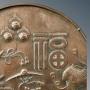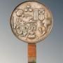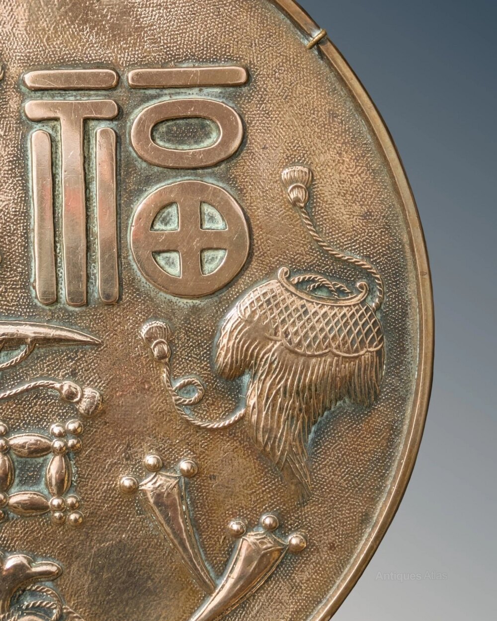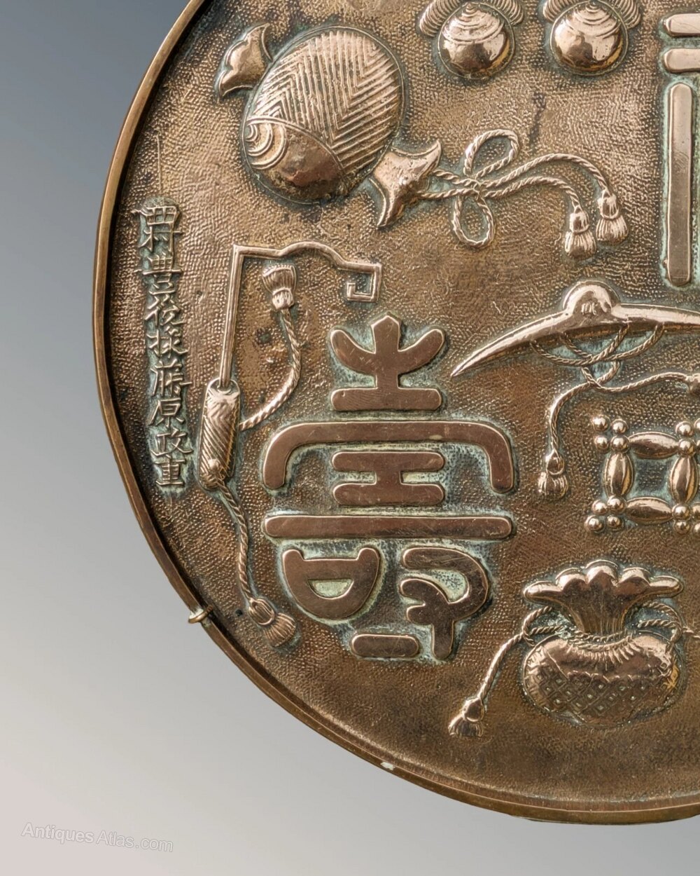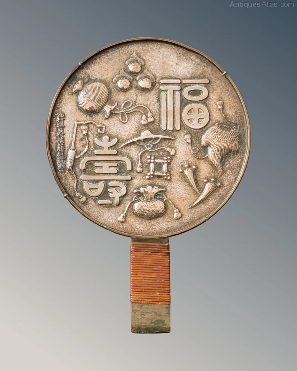This is a really beautiful Japanese, solid bronze hand held mirror with a great colour and patina dating from around 1890. The well decorated side has raised cast designs with many corded strung bags representing wealth and good fortune as well as calligraphic symbols and letters and three flaming pearls which were symbolic of spiritual energy, wisdom, good fortune, wealth, power and enlightenment.