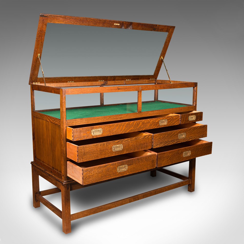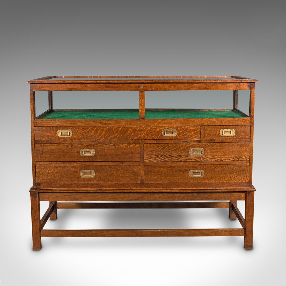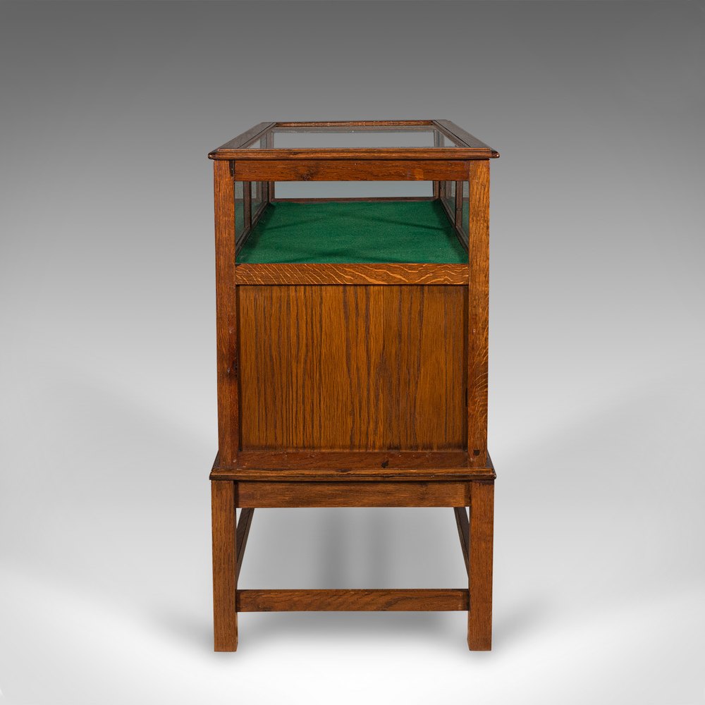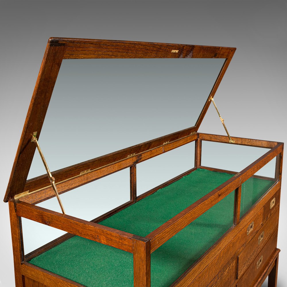 This is an antique jeweller's display cabinet. An English, oak shop or haberdasher's showcase, dating to the Edwardian period, circa 1910.