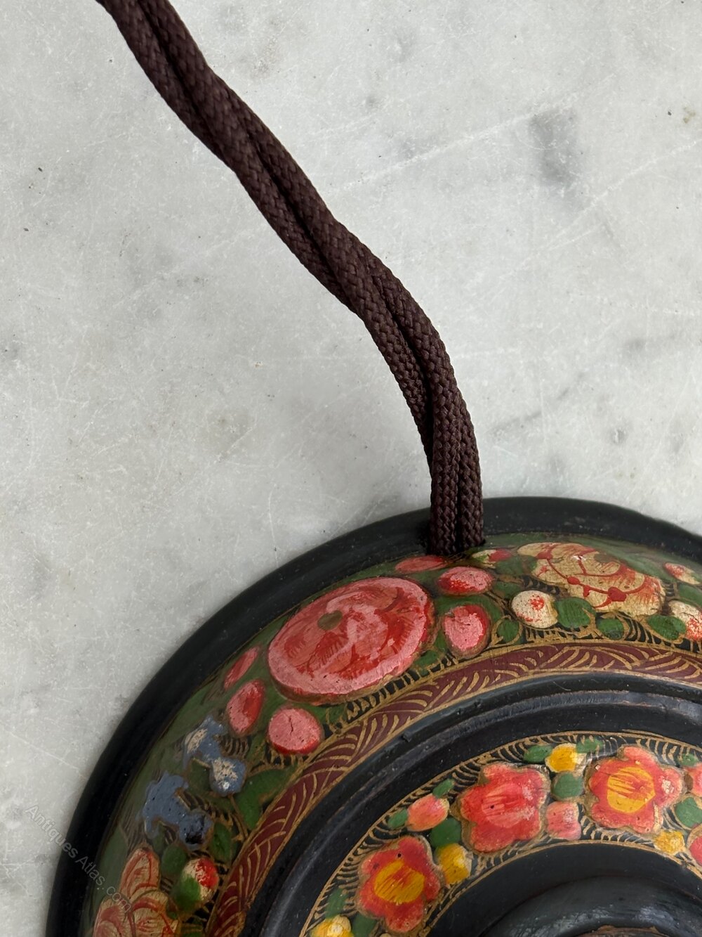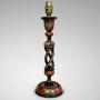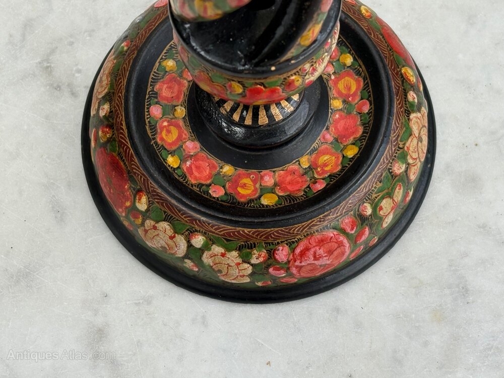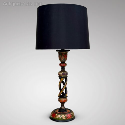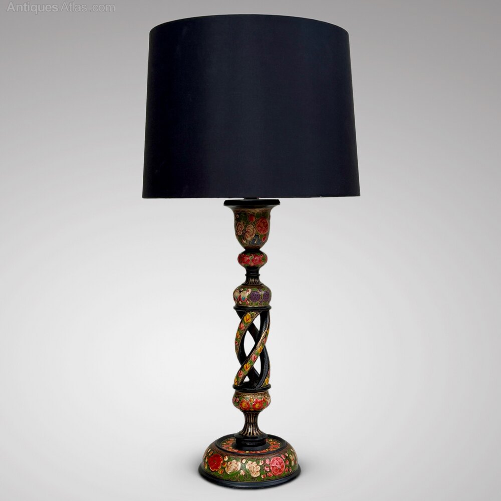 A decorative wooden and paper mache table lamp raised on a knopped and twisted stem and a circular base. The lamp is painted in the traditional style of the Kashmir region of Northern India. The condition is good, the lamp stands evenly and firmly, has been tested and is wired to be compatible to the UK mains system. This antique lamp is ready to place in any room. Shade not included.