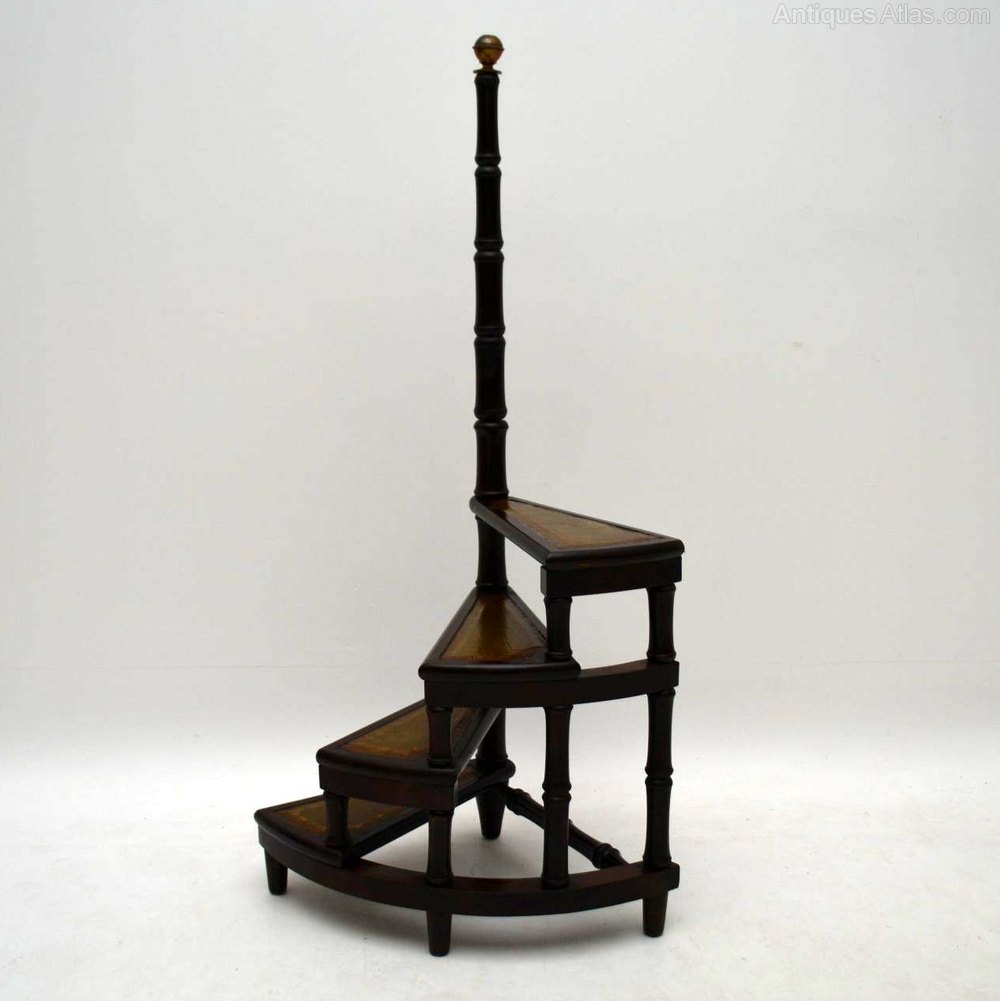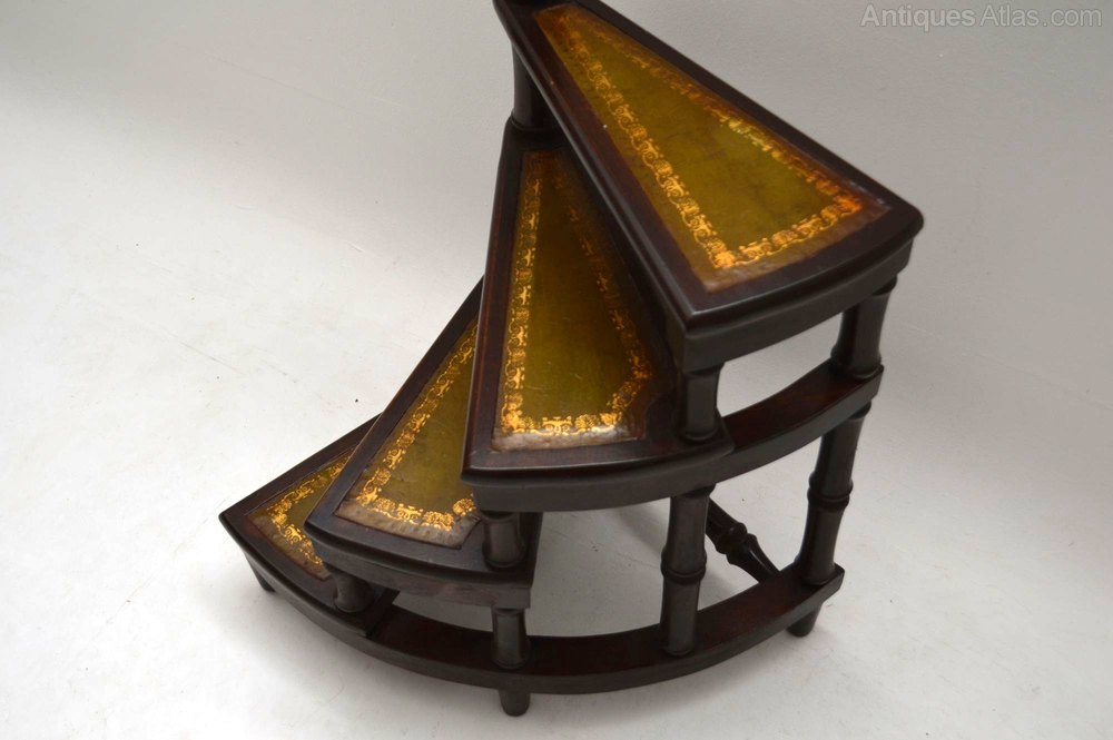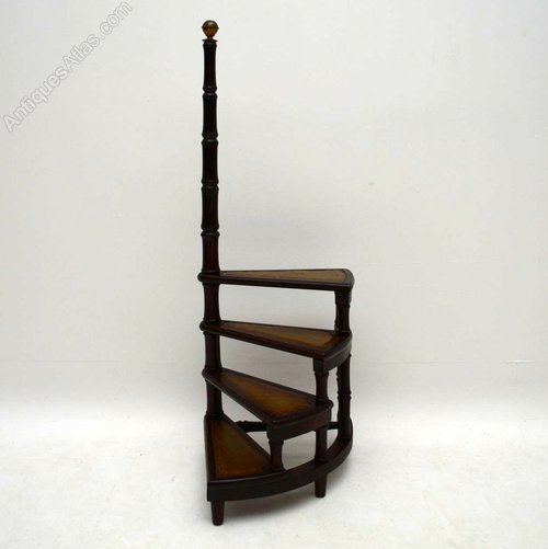 Antique Georgian style mahogany spiral library steps, with inset tooled leather on the steps & a brass finial on top of the turned column. These steps are in good original condition & date from around the 1950’s period. Please check the measurements, because these library steps are quite small in proportion.