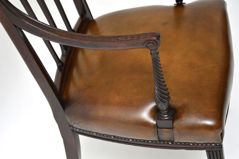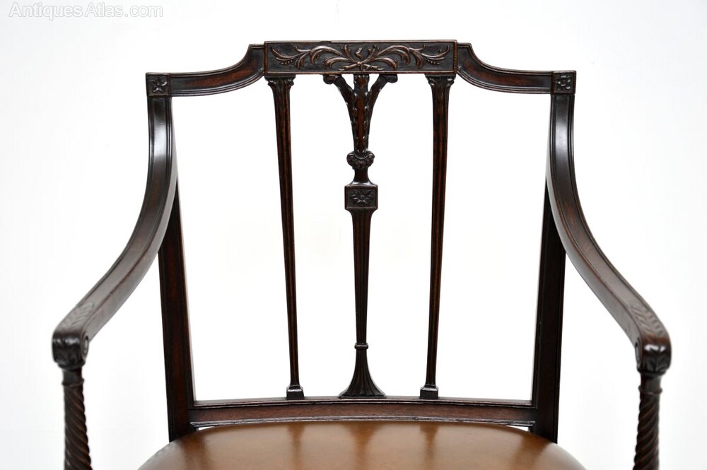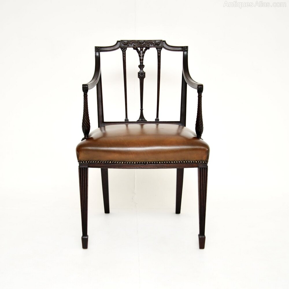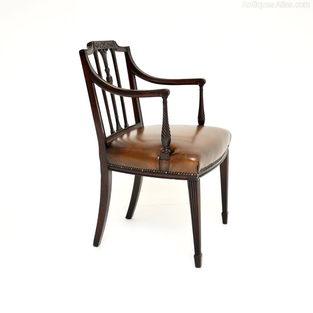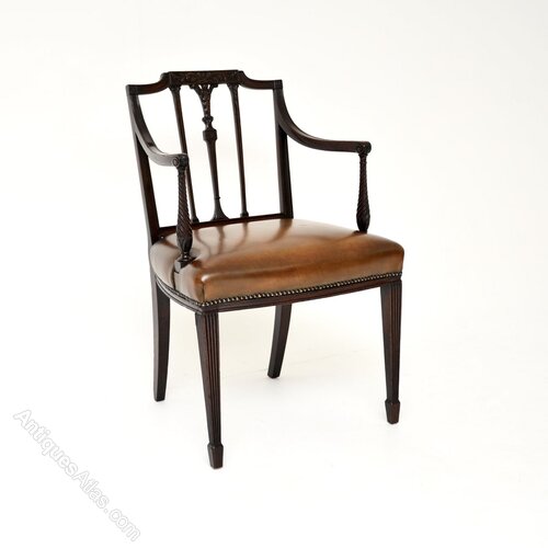 A smart and beautifully designed antique mahogany and leather carver armchair / desk chair. This was made in England, it dates from around 1900-1910, though it could possibly be earlier.
