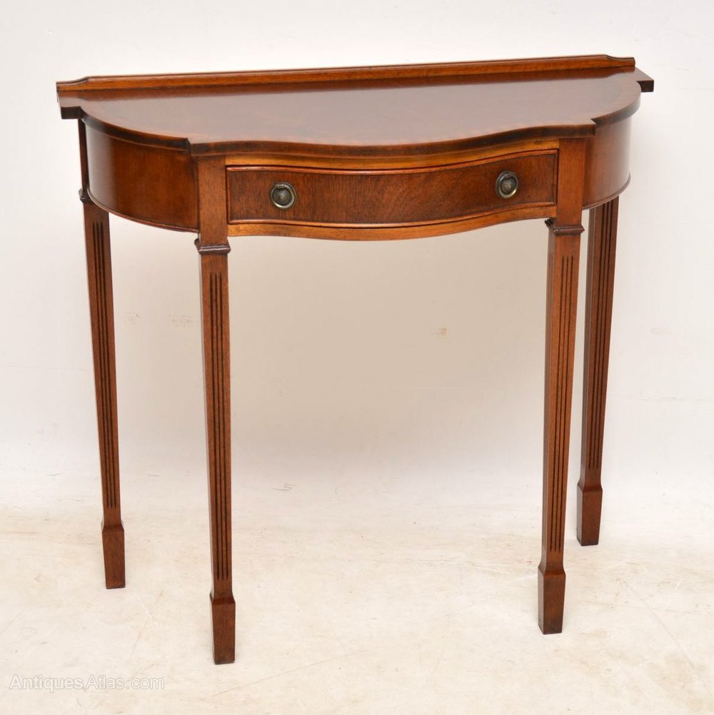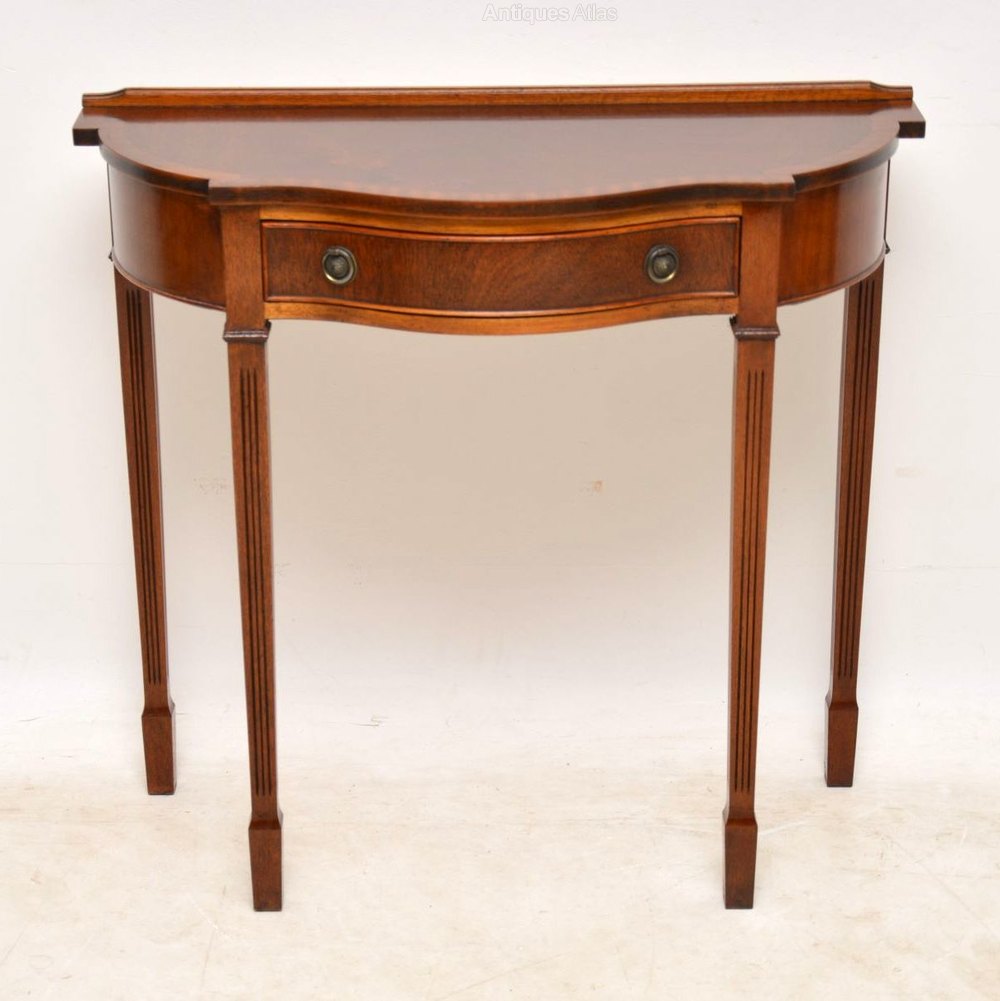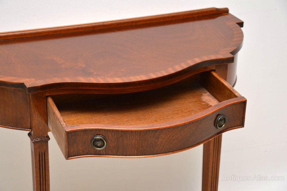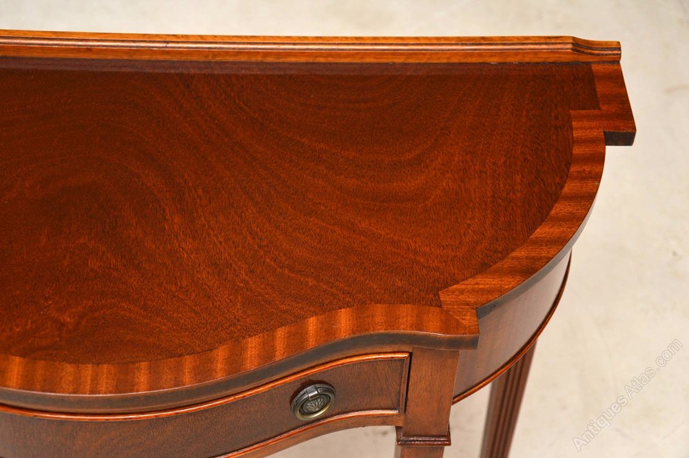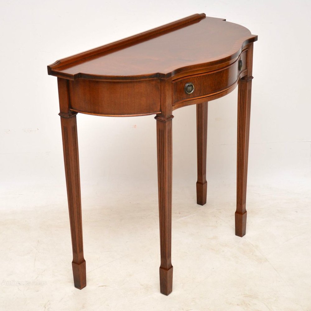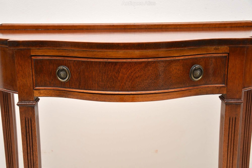 Antique Georgian style mahogany console table with a serpentine shaped front & in good condition. It has a cross banded top edge, one drawer in the middle with brass handles & sits on reeded tapered legs with elongated spade end feet. I would date this table to around the 1950’s period & it’s just been French polished.