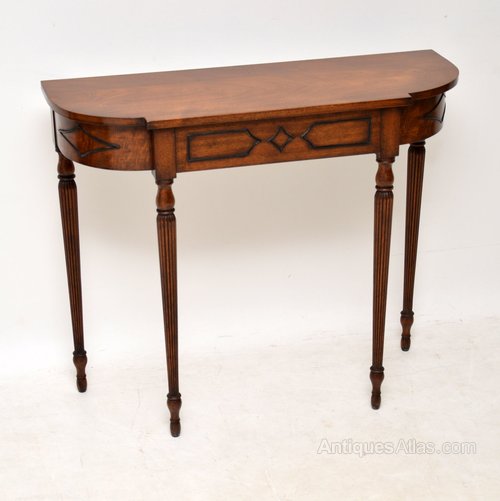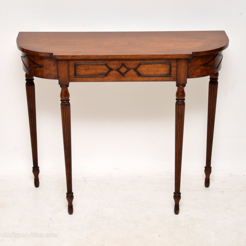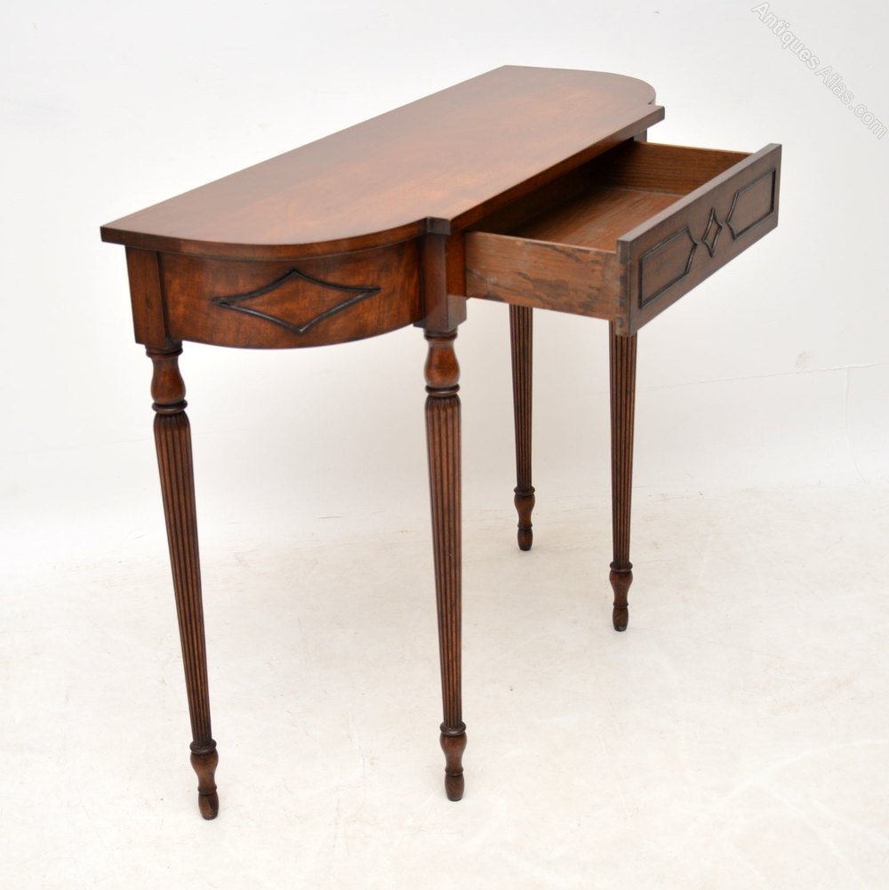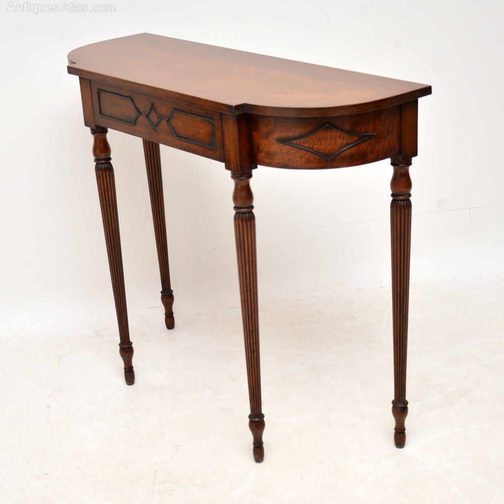 This antique mahogany console side table is in good original condition, with plenty of character and is of high quality. It’s nice and slim from back to front, which is always a popular feature. There are well shaped beadings around the front, the elegant legs are turned and fluted. I particularly like the way the middle drawer is concealed. I would date this table to around the 1920-30’s period.